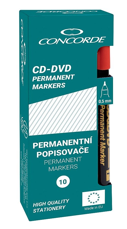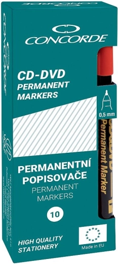 Univerzální permanentní popisovač CONCORDE je ideální pro přesné a trvalé popisování CD a DVD, ale i dalších povrchů, jako je plast, sklo, porcelán či fólie. Nabízí rychleschnoucí inkoust na lihové bázi, který je voděodolný a odolný proti setření, a přesto jej lze smýt lihem. Jemná šíře stopy 0,5 mm (F) zajistí čisté a čitelné popisky.