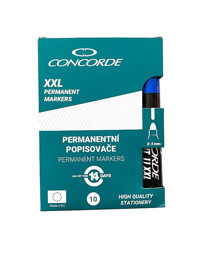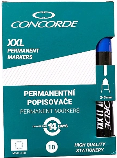 Univerzální permanentní popisovač CONCORDE s alkoholovým inkoustem pro spolehlivý popis folií, skla, plastu, dřeva i kovu. Nabízí nesmazatelný a voděodolný zápis, neprůhledný inkoust a pohodlnou šíři stopy 3 mm s kulatým hrotem. Vydrží až 14 dní bez víčka bez vyschnutí.