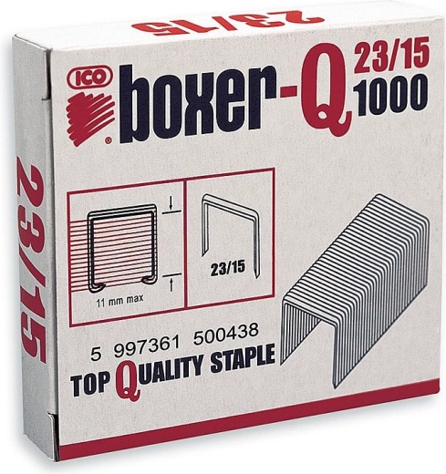 Díky délce nožiček 15 mm snadno sešijí svazky papíru do tloušťky 11 mm. Standardizovaná velikost 23/15 je kompatibilní s odpovídajícími pákovými a těžkými sešívačkami.