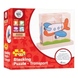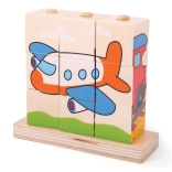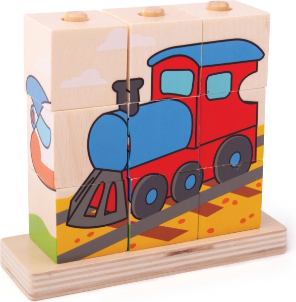 Dřevěný puzzle Bigjigs Baby Dopravní prostředky je ideální hračkou pro rozvoj motorických dovedností a koordinace rukou a očí u dětí. Obsahuje 10 kusů dřevěných bloků s čtyřmi dopravními scénami: vlak, auto, traktor a letadlo.