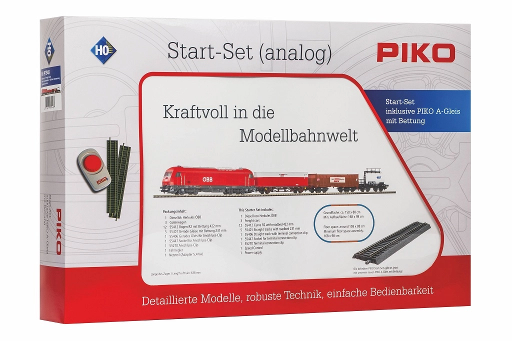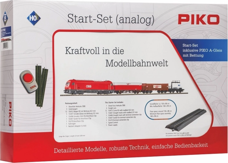 Set obsahuje ovál PIKO A-Gleis s integrovaným štěrkovým ložem, který umožňuje rychlé sestavení bez složitých úprav podloží. Díky standardům NEM (šachta pro spřáhlo, rozhraní NEM 652) lze soupravu snadno rozšiřovat, vylepšovat a později digitalizovat. Kompaktní rozměry kolejiště se vejdou i do menších prostor, přitom nabízejí stabilní provoz a možnost dalšího rozšíření.
