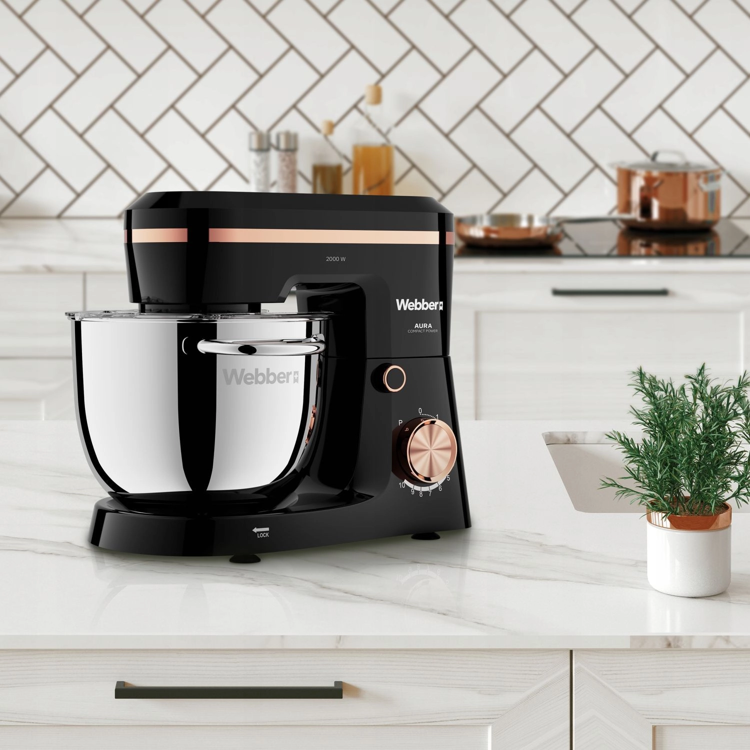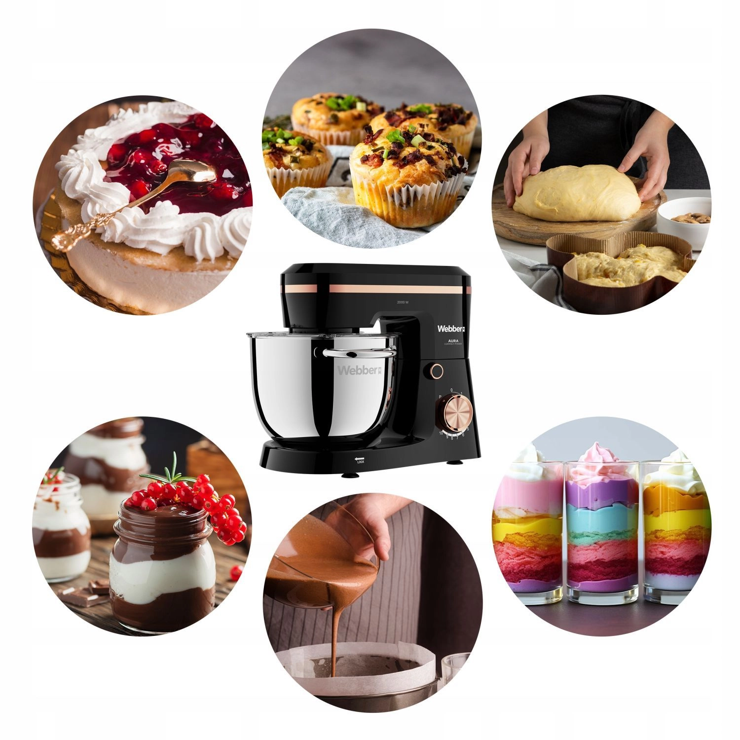 WEBBER Aura je spolehlivý pomocník pro každodenní vaření i náročné pečení. Silný motor 2000 W a přesný planetární pohyb zajistí rovnoměrné promíchání surovin – od nadýchaných krémů a sněhů až po hutná kynutá těsta na chléb, pizzu či knedlíky. 5,2l nerezová mísa (BPA free) poskytuje dostatek prostoru pro přípravu i pro větší rodinu.