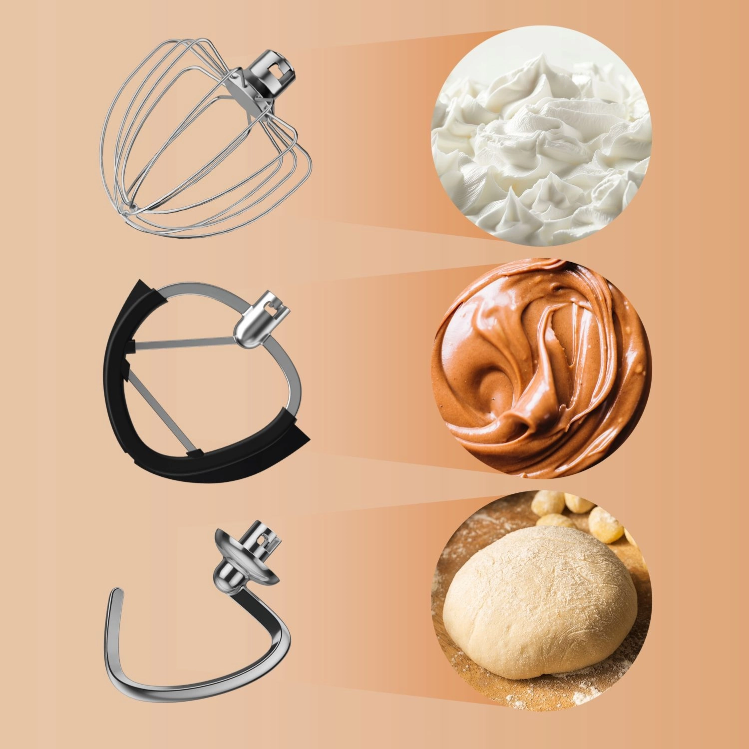 V balení najdete nerezovou mísu 5,2 l, metlu, plochý šlehač, hnětací hák, kryt proti odstřiku a stěrku pro maximální univerzálnost.