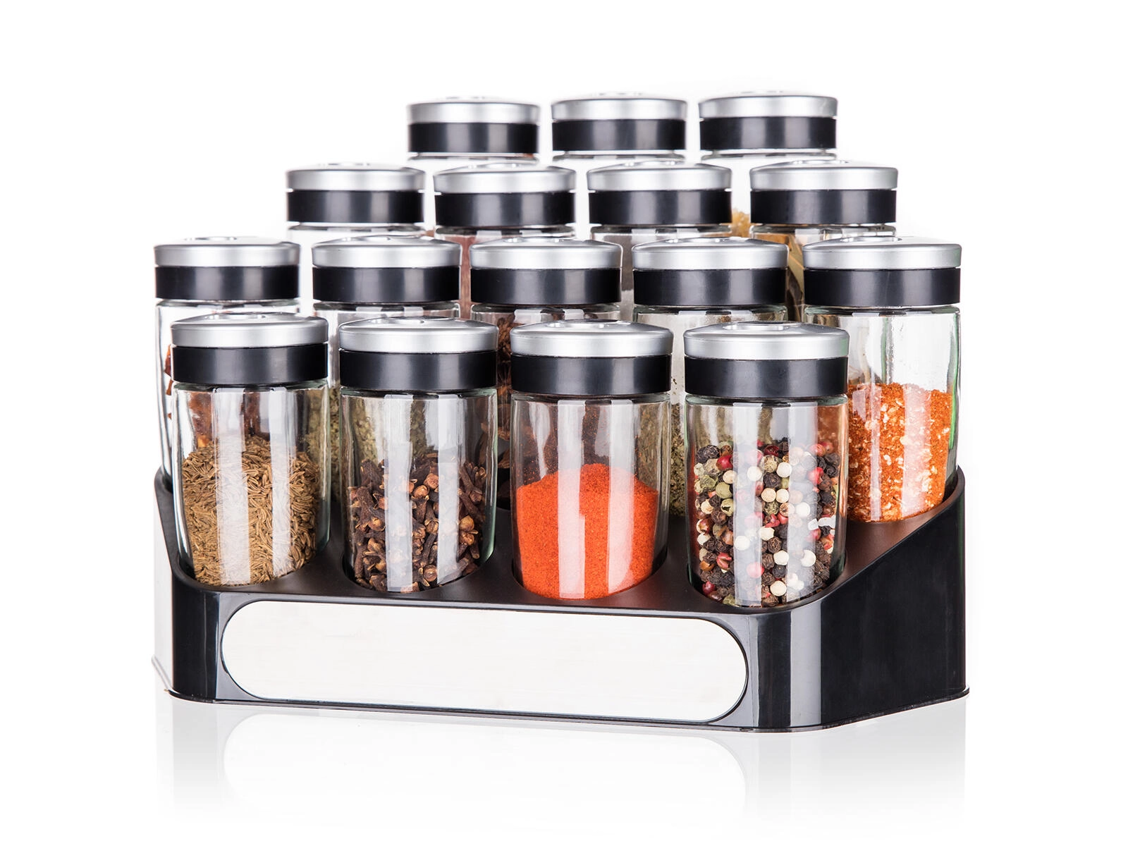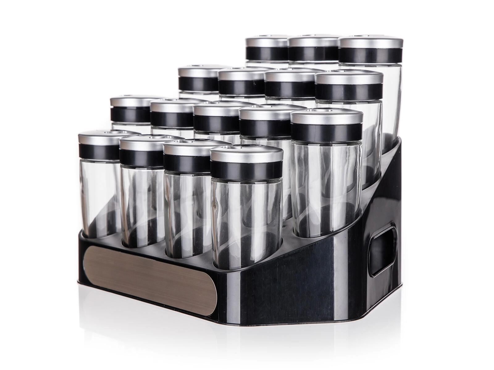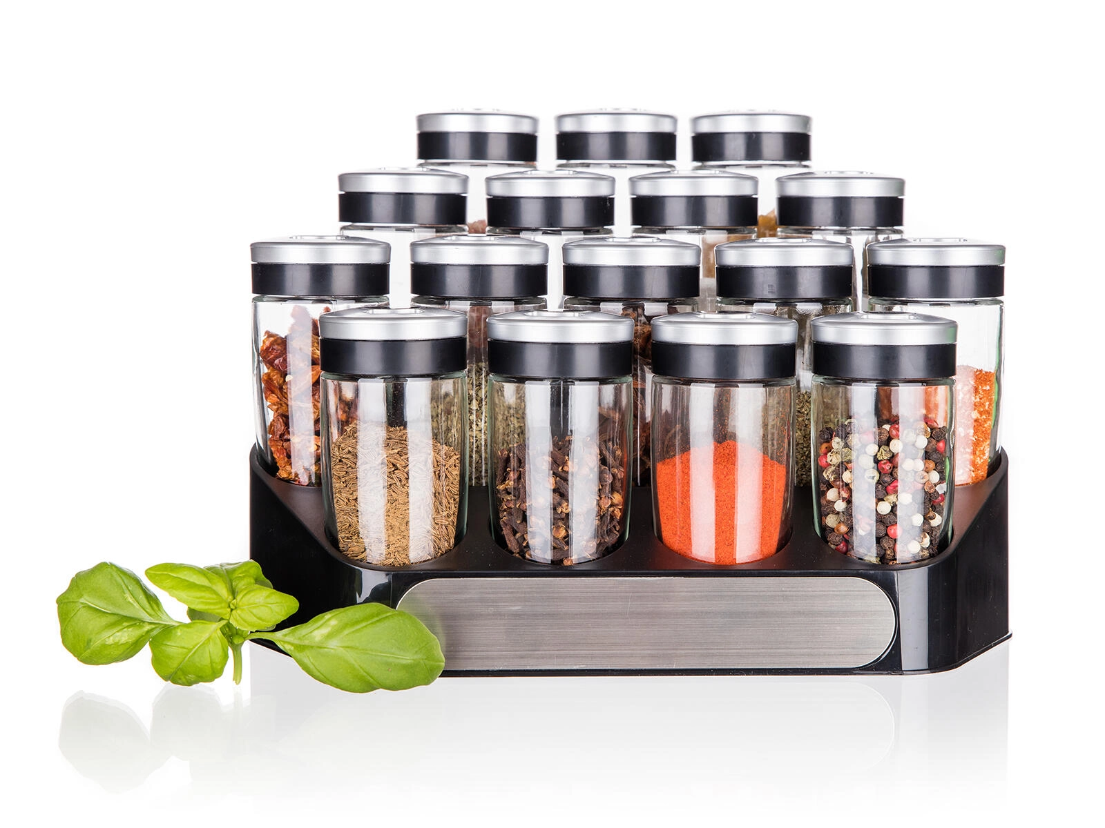 Stabilní stojan z ABS udržuje všech 16 kořenek přehledně a na dosah – ideální na kuchyňskou linku či do spíže.