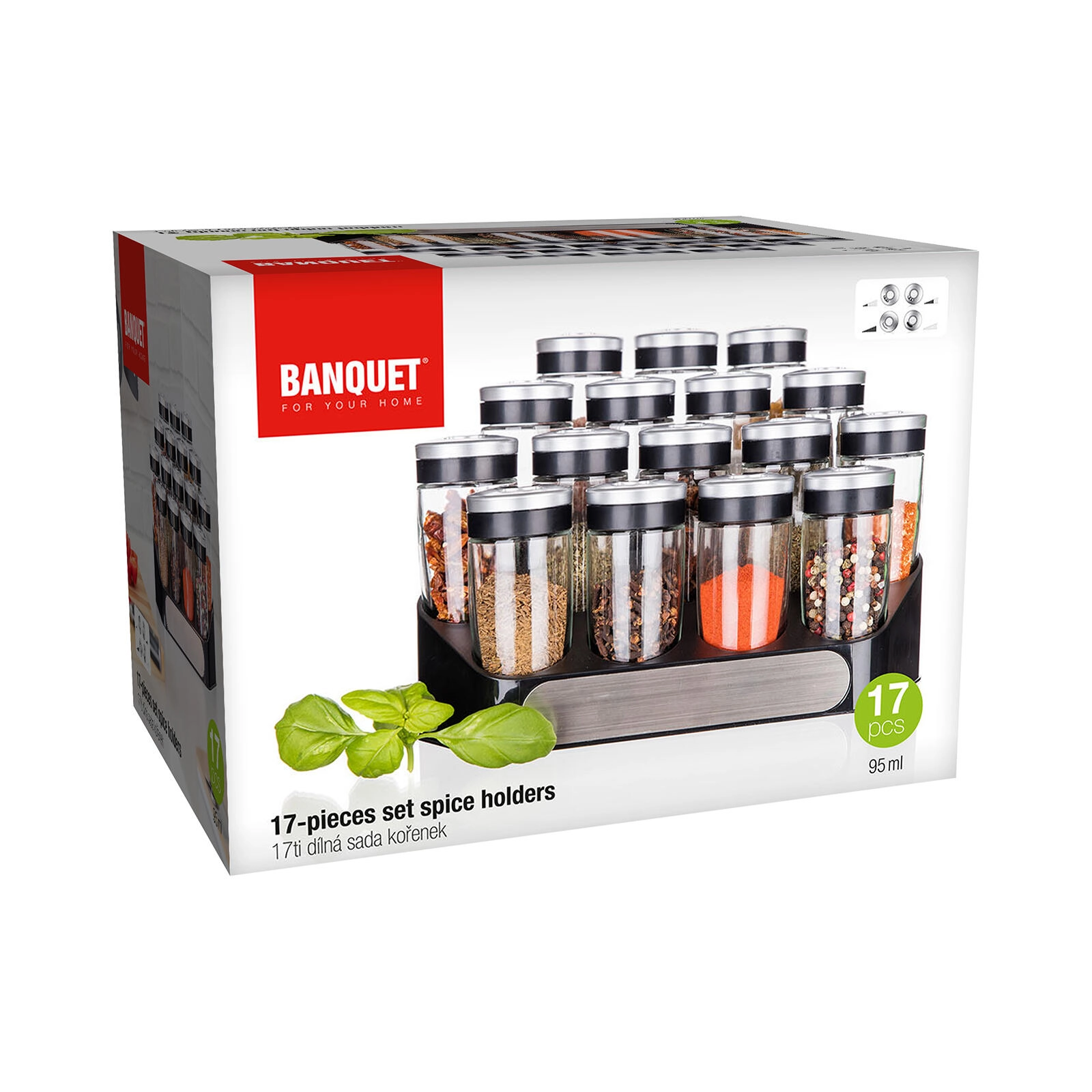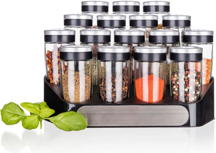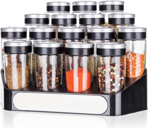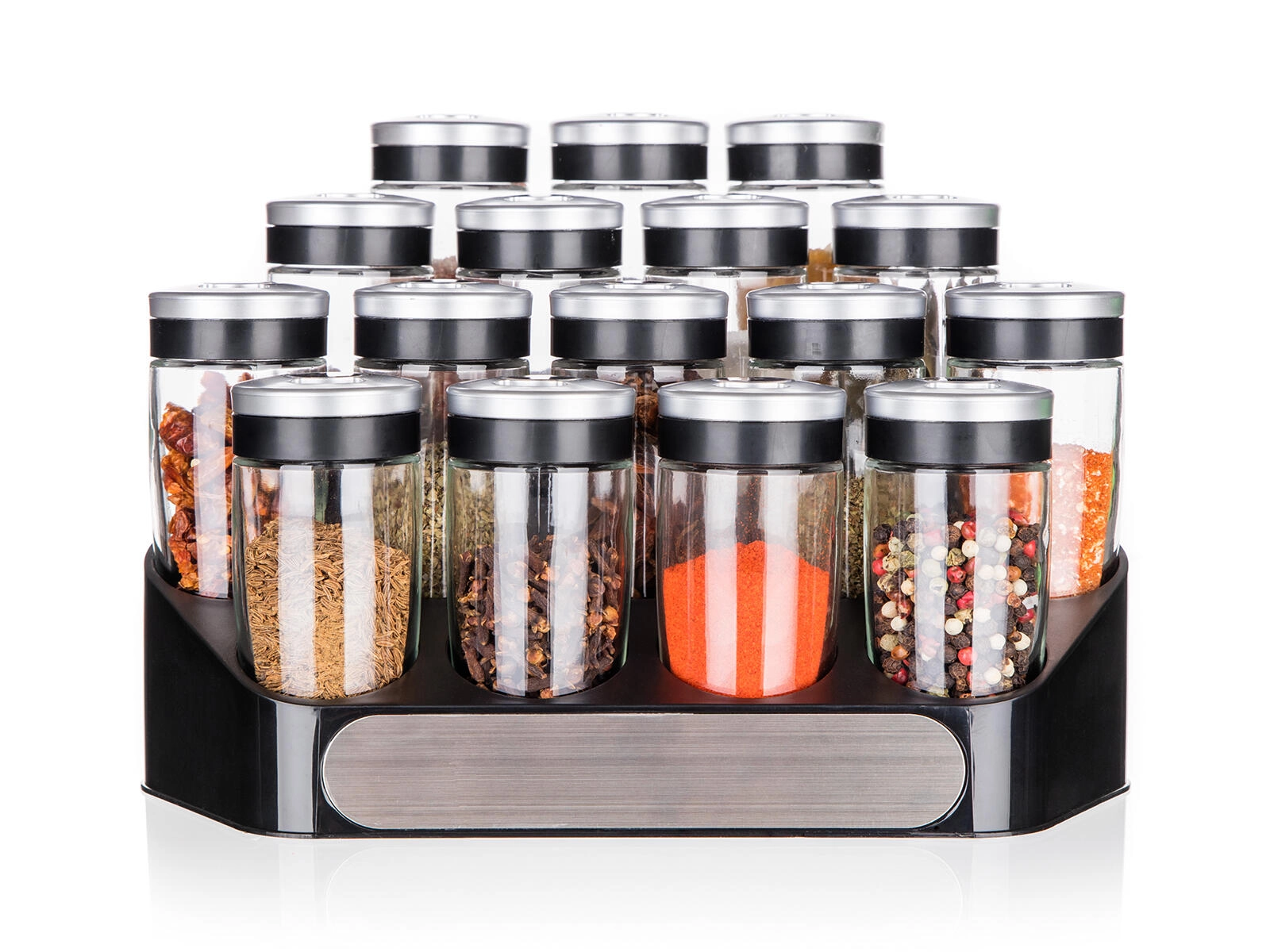 Stabilní stojan z ABS udržuje všech 16 kořenek přehledně a na dosah – ideální na kuchyňskou linku či do spíže.