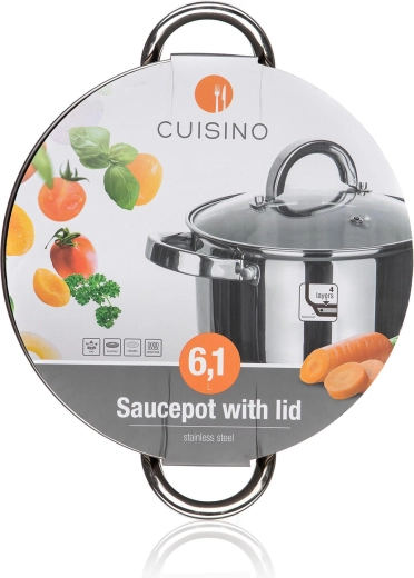 Praktický nerezový hrnec CUISINO o objemu 6,1 l a průměru 24 cm je ideální pro každodenní vaření. Nabízí skleněnou poklici pro snadnou kontrolu pokrmů, vnitřní měrku objemu pro přesné dávkování a robustní nerezová držadla pro bezpečnou manipulaci. Díky lesklé povrchové úpravě vypadá elegantně a je vhodný na všechny typy varných desek.