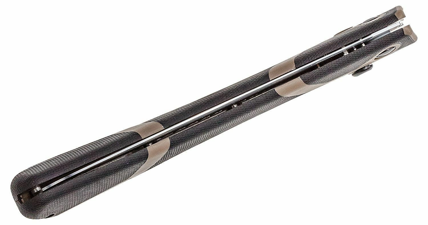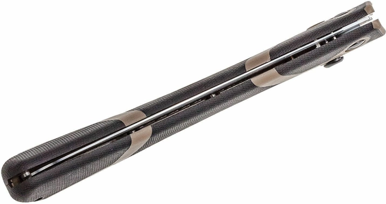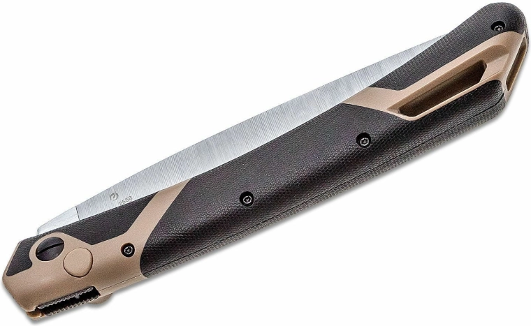 Ergonomická rukojeť z GFN (sklem plněný nylon) v kombinaci s gumovými črienkami zaručuje jistý, neklouzavý úchop i v rukavicích a za mokra. Tlačítková pojistka Button Lock bezpečně zajišťuje otevřenou čepel a umožňuje snadné a kontrolované skládání.