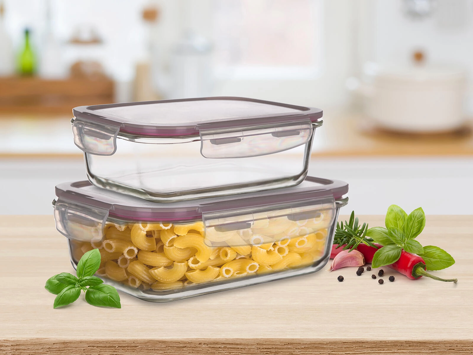 Praktická sada dvou obdélníkových skleněných dóz Lora o objemu 0,55 l a 0,95 l s polypropylenovými víčky nabízí hermetické uzavření, bezpečné uchování čerstvosti a všestranné použití v kuchyni. Vhodné pro pečení v troubě (bez víčka), ohřev v mikrovlnné troubě, zmrazování i přepravu jídel. Víčko je transparentní s bordovým těsněním pro spolehlivé utěsnění.