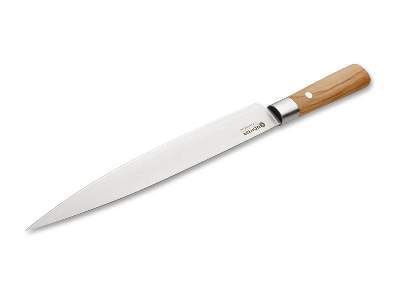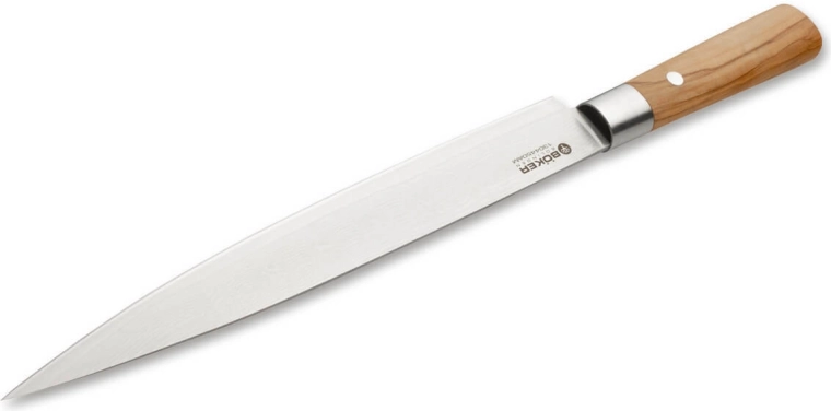 Krájecí nůž Böker Manufaktur Solingen Damascus Olive je navržen pro přesné a hladké krájení tenkých plátků i kostiček. Dlouhá, tenká čepel z vícevrstvé damaškové oceli poskytuje excelentní kontrolu při řezu a minimalizuje trhání vláken masa i ryb.