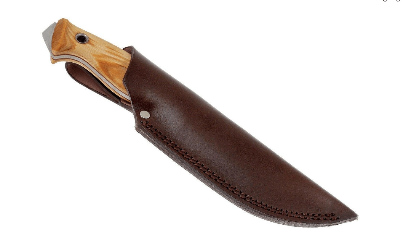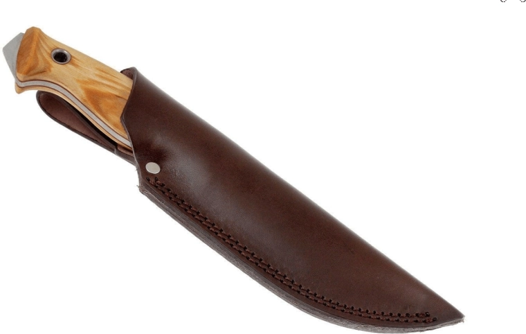 Plná konstrukce full-tang zajišťuje výjimečnou pevnost a stabilitu při náročné práci. Rukojeť z jednoho kusu kudrnaté břízy je ručně broušená, leštěná a olejovaná, takže krásně padne do ruky a nabízí jedinečný přírodní vzhled. Kožené pouzdro umožňuje bezpečné a stylové nošení na opasku.