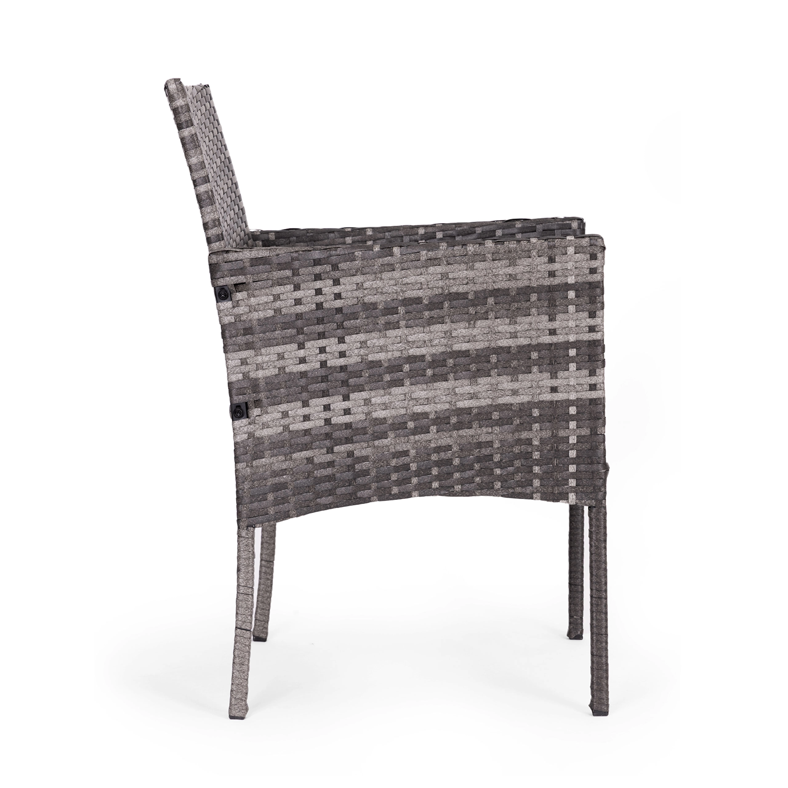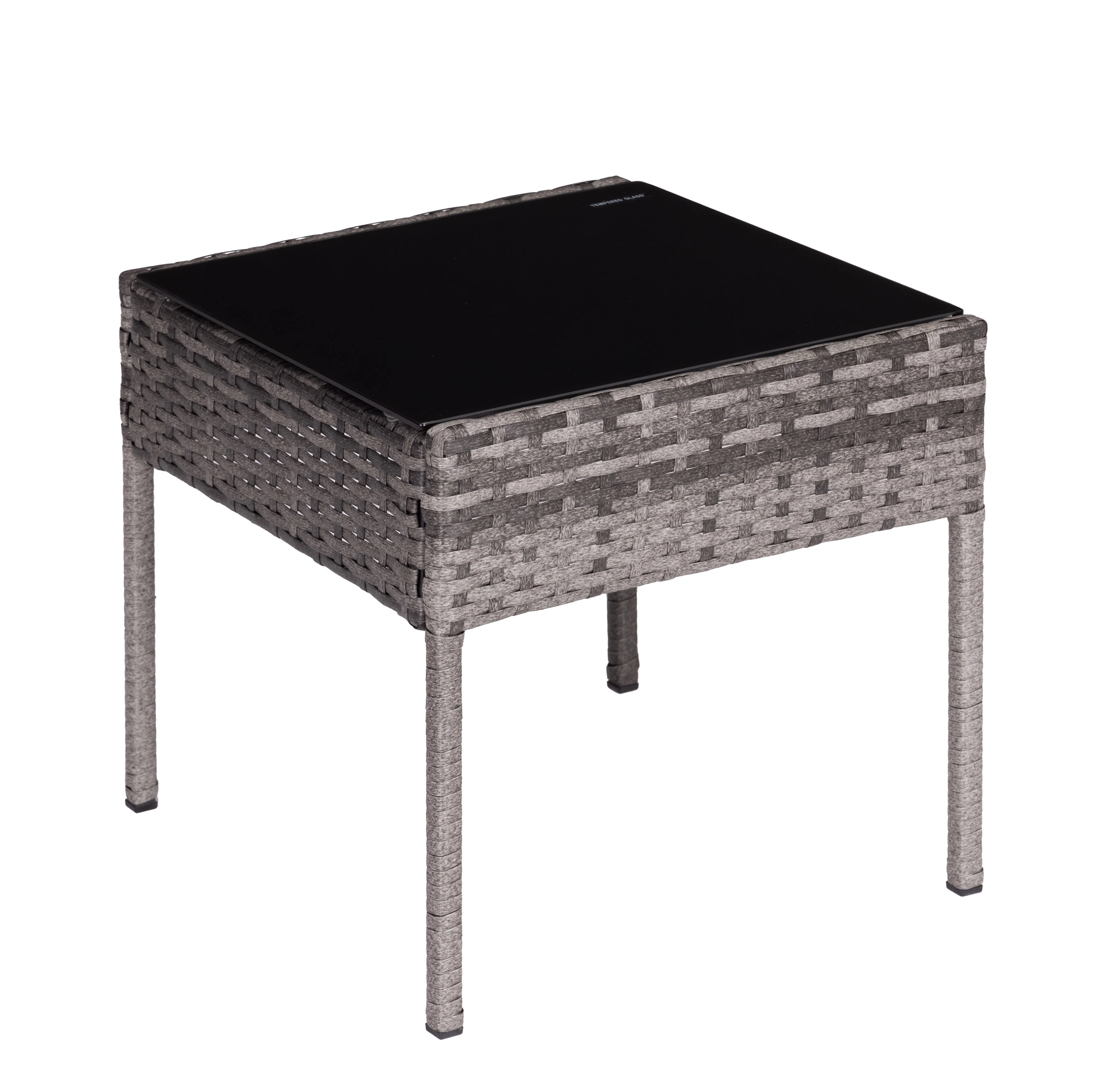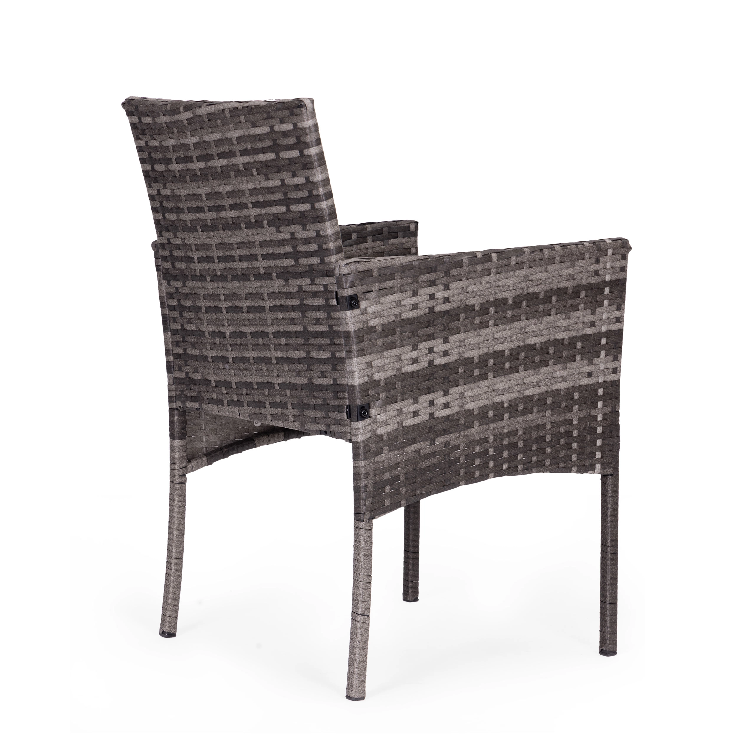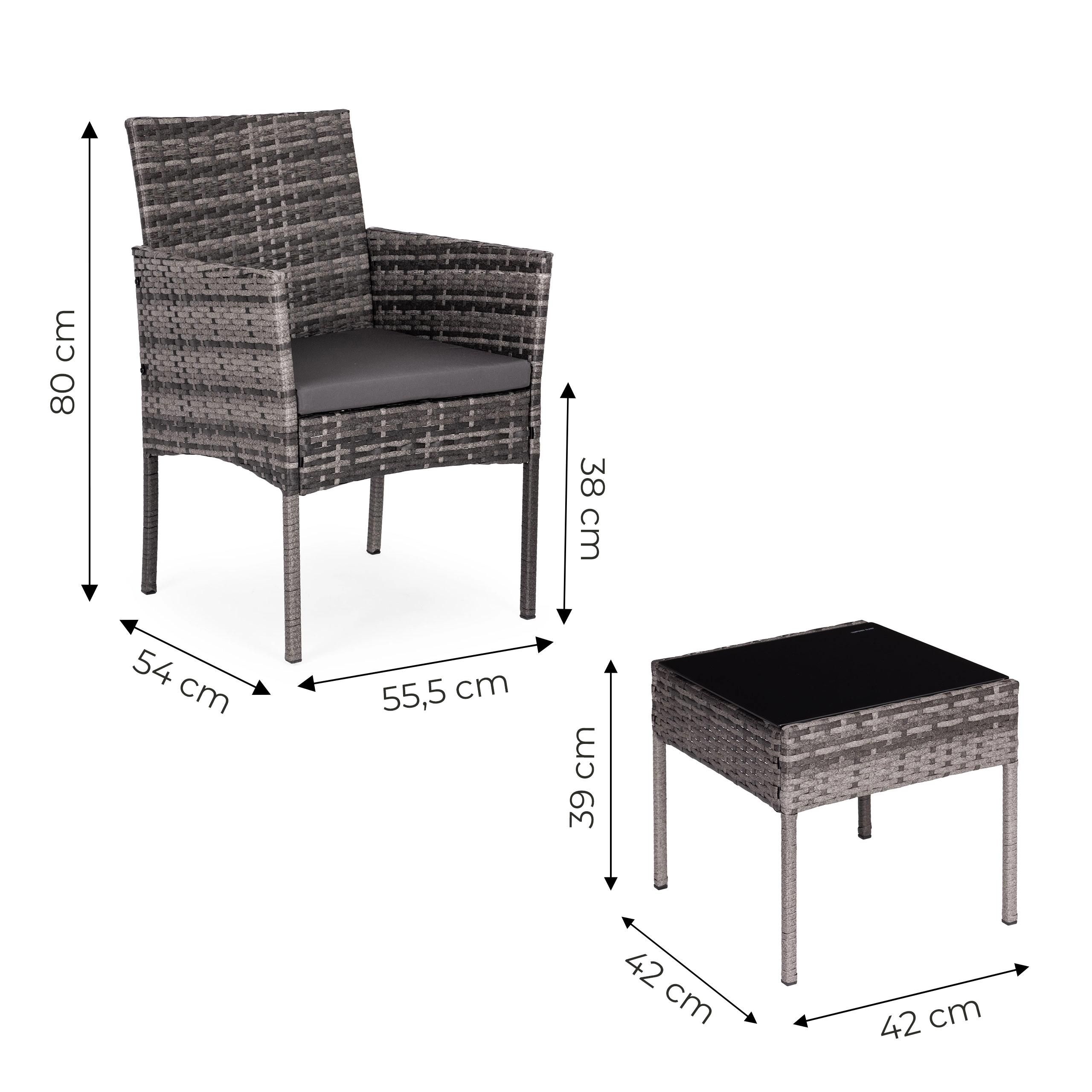 Čtvercový stolek se zabezpečenou tvrzenou deskou (5 mm) je ideální pro nápoje a drobnosti, křesla doplňují měkké podušky s odolností vůči UV a vlhkosti. Protiskluzové koncovky nohou zvyšují stabilitu na různých površích a chrání podlahu.