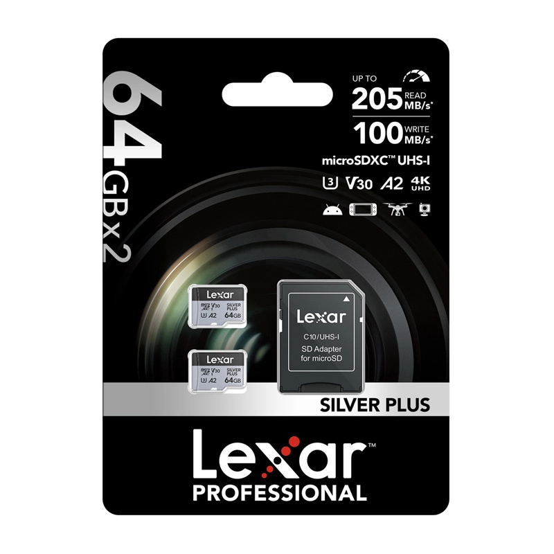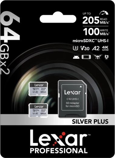 Rozšiřte úložiště svých zařízení sadu dvou karet LEXAR Silver Plus microSDXC 64 GB. Díky třídám UHS-I, Class 10, U3 a A2 zvládají karty 4K video při 60 FPS, rychlé sekvenční snímání i náročné mobilní aplikace. Součástí balení je SD adaptér pro použití ve fotoaparátech, kamerách a notebookách.