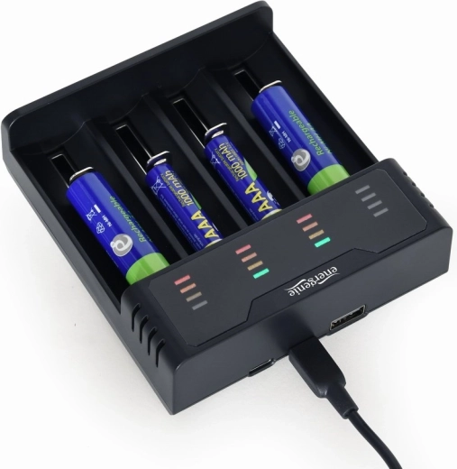 Univerzální USB nabíječka s čtyřmi nezávislými sloty pro rychlé a snadné nabíjení akumulátorů Ni‑MH i Li‑ion. Nabízí kompaktní a lehkou konstrukci, širokou kompatibilitu velikostí článků a spolehlivou ochranu při nabíjení.