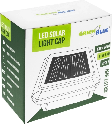 Elegantní solární čepička na plotový sloupek o rozměru 80 × 80 mm od značky GreenBlue se přes den nabíjí ze slunce a po setmění automaticky svítí. 8 kvalitních LED vydává příjemné teplé bílé světlo 3200 K se světelným tokem 7 lm, které vytváří útulnou atmosféru bez oslnění. Jednoduchá instalace, elegantní čtvercový design a úsporný provoz bez kabelů jsou ideální pro zahradu, terasu, vstupní bránu i příjezdovou cestu.