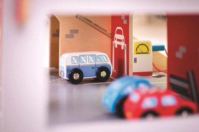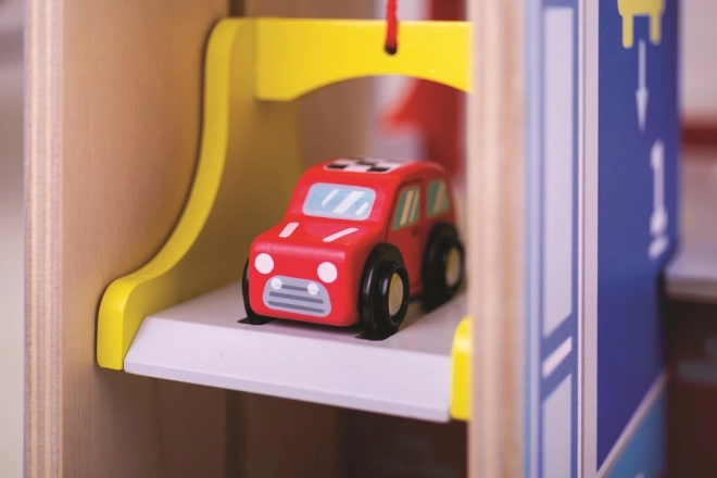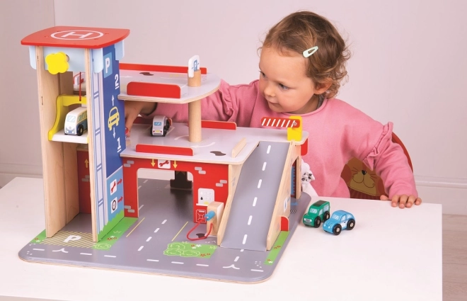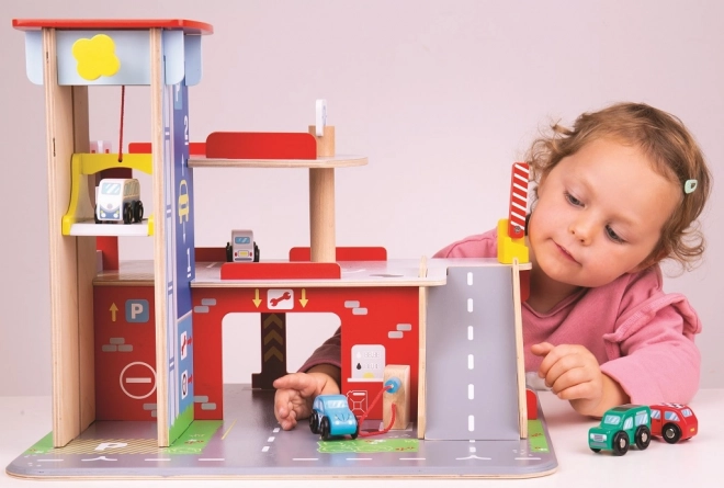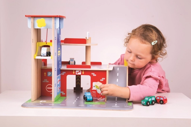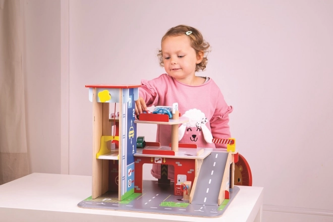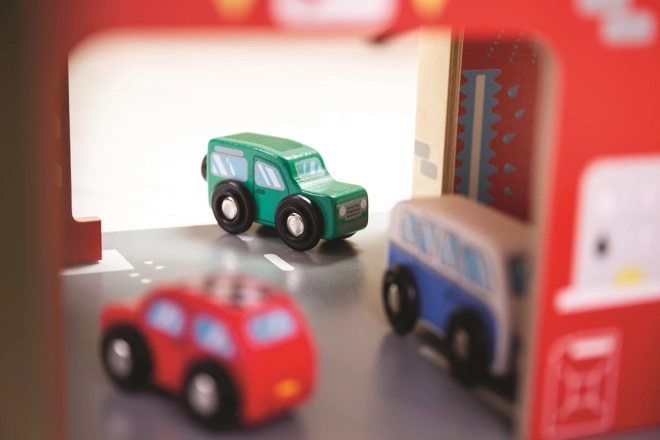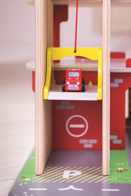 Tato robustní dřevěná garáž přináší realistické prvky skutečného parkovacího domu: děti vyvezou autíčko manuálním výtahem do vyšších pater, zaparkují na vyznačených místech a sjíždějí po rampě se závorou. V přízemí je připraven servis, autoumyvárna a čerpací stanice pro kompletní péči o vozidla.