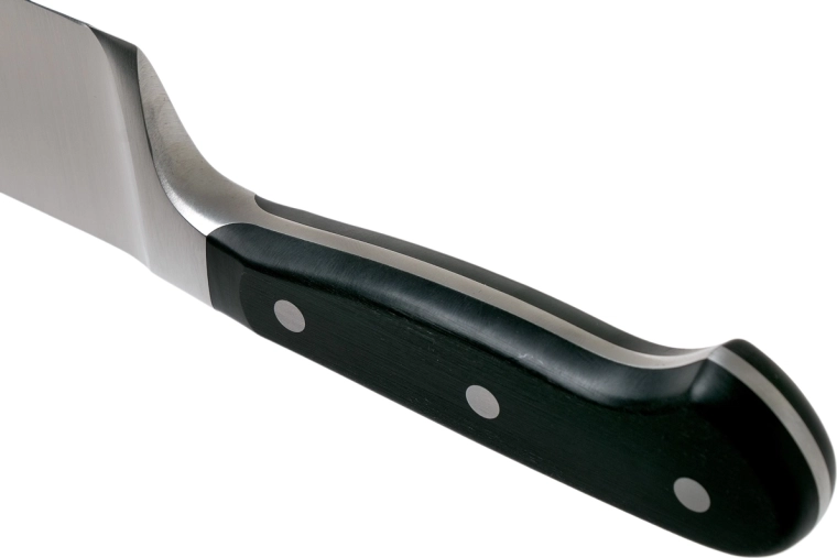 Díky ergonomicky tvarované rukojeti se třemi nýty sedí jistě v ruce a umožňuje bezpečnou a pohodlnou práci i při delším krájení. Tento univerzální nůž zvládne vše od sekání bylinek přes porcování masa až po jemné plátkování zeleniny.