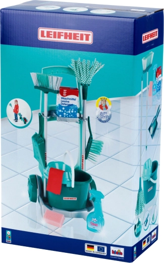 Dětský úklidový set s oficiální licencí LEIFHEIT vypadá jako opravdové náčiní, ale je bezpečně uzpůsoben pro malé pomocníky. Robustní vozík s kolečky má držáky na nástroje, polici na kbelík i místo na krabičku s „detergentem“, takže si děti mohou připadat jako při skutečném úklidu.