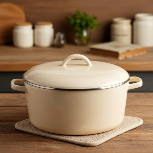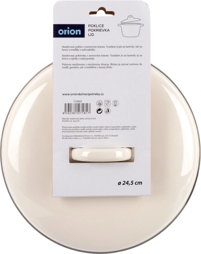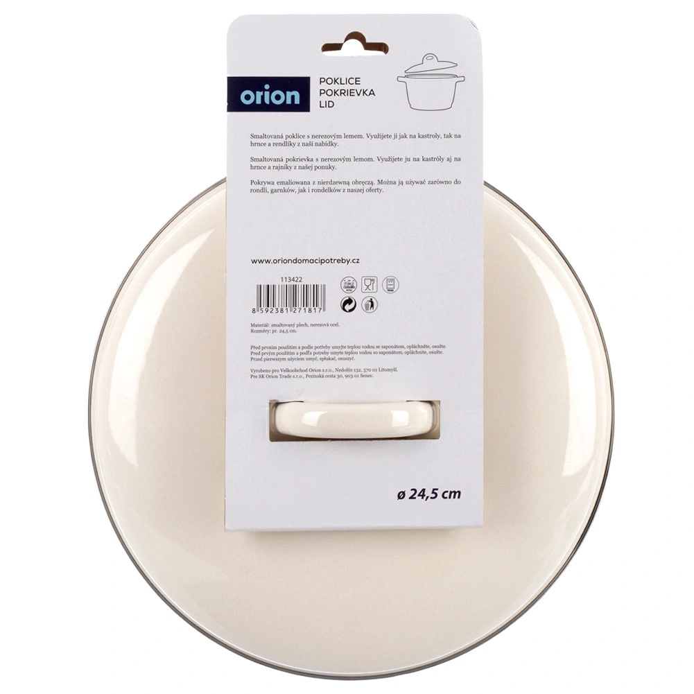 Univerzální smaltovaná poklice v elegantní krémové barvě spolehlivě pasuje na většinu nádobí o průměru 24,5 cm. Kovová obruč po obvodu zajišťuje pevné dosednutí na okraj nádoby, čímž pomáhá lépe utěsnit páru, urychlit vaření a snížit spotřebu energie. Kvalitní smalt je hygienický, snadno se čistí a je šetrný i pro osoby s citlivostí či alergiemi.