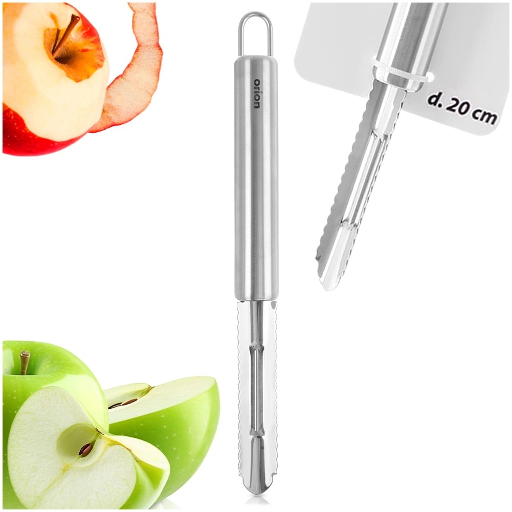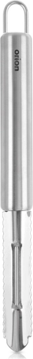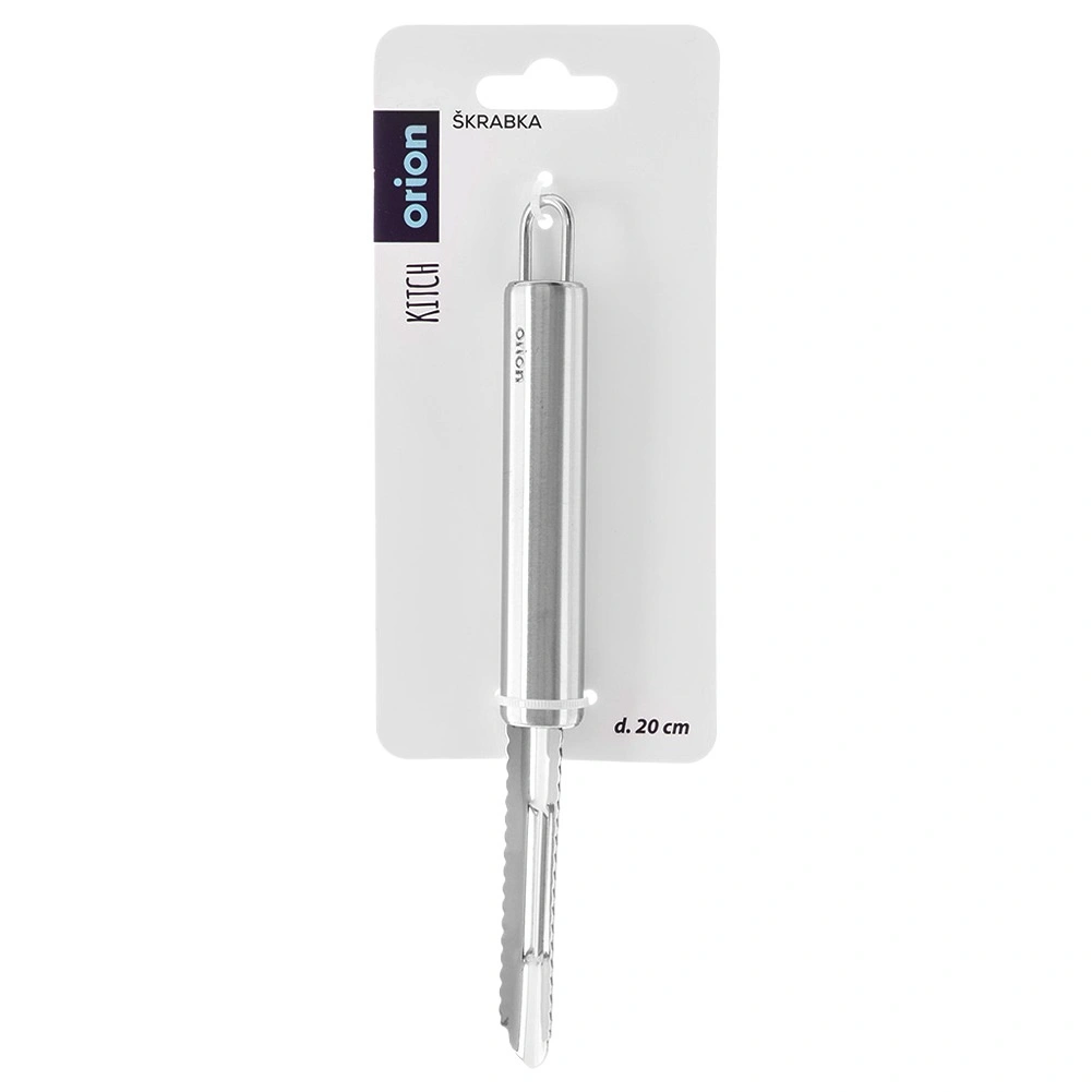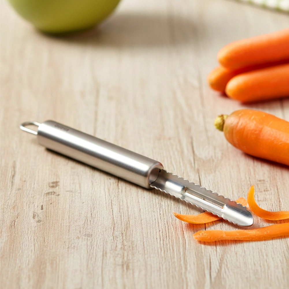 Praktická nerezová škrabka na ovoce a zeleninu s vertikálním, výkyvným vroubkovaným ostřím pro rychlé a přesné loupání. Díky ergonomické rukojeti skvěle padne do ruky, je vhodná pro praváky i leváky a snadno se udržuje. Odolná nerezová ocel, ostrý a přesný břit 7,5 cm a poutko na zavěšení z ní dělají spolehlivého pomocníka do každé kuchyně.