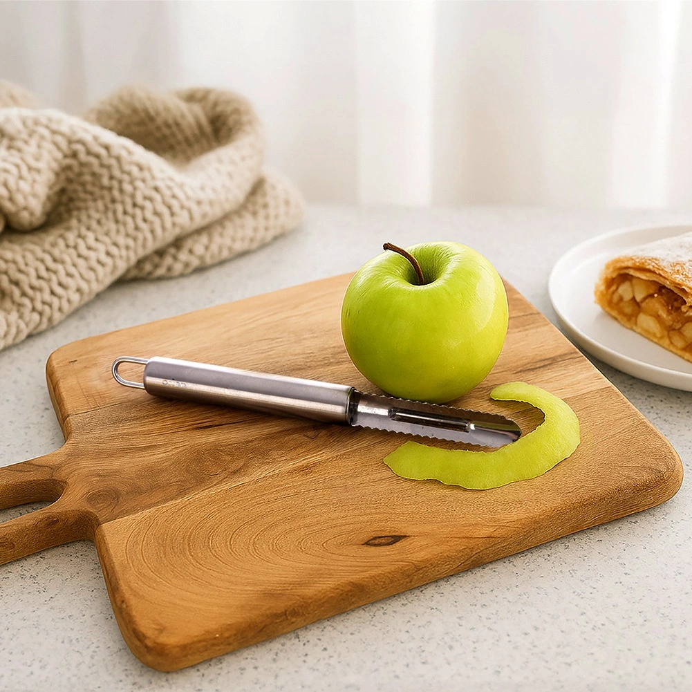 Výkyvné, vroubkované ostří přesně kopíruje tvar plodu a odebírá jen tenkou vrstvu, takže šetří čas i suroviny.