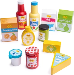 Tato propracovaná dřevěná sada obsahuje výběr oblíbených „trvanlivých“ potravin – například kečup, dresink, mléko, jablečný, pomerančový a citronový džus, džem, máslo, pesto, sýr či jogurt. Realistické tvary a barevné etikety děti lákají ke hře a přitom nenápadně učí poznávat potraviny a mluvit o zdravém stravování.
