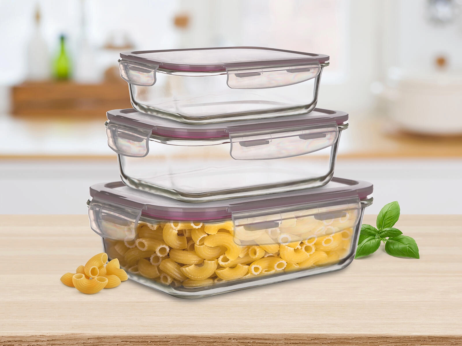 Praktická sada tří obdélníkových skleněných dóz Lora s transparentními PP víčky a bordovým těsněním uchová vaše potraviny déle čerstvé. Dózy jsou hermeticky uzavíratelné, vhodné pro mrazák, mikrovlnnou troubu a do pečicí trouby bez víčka. Ideální pro skladování, přenášení i ohřev pokrmů.