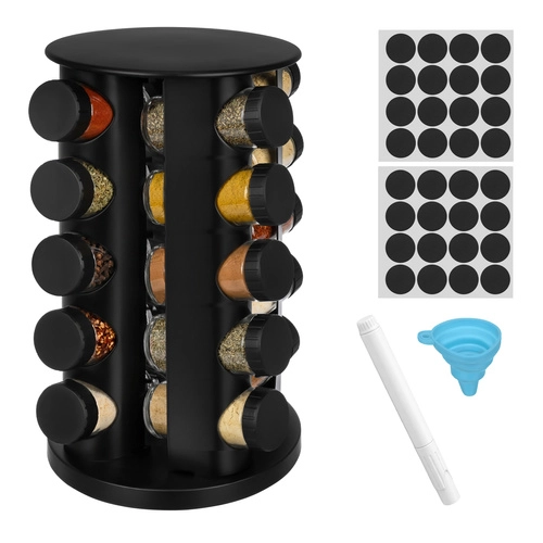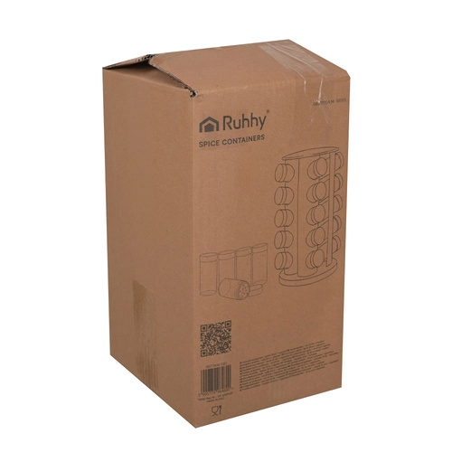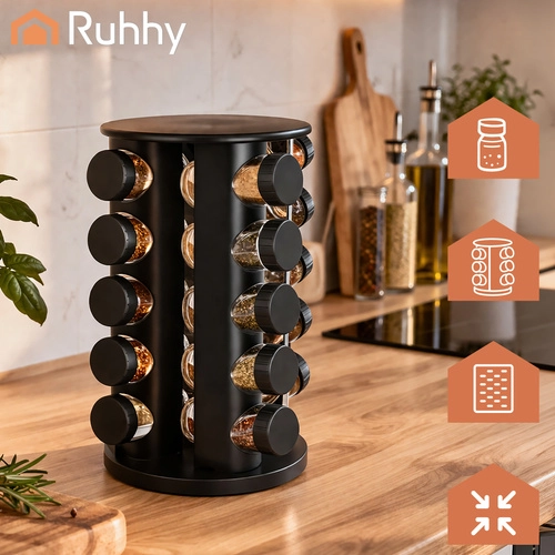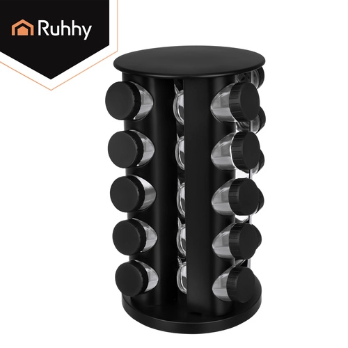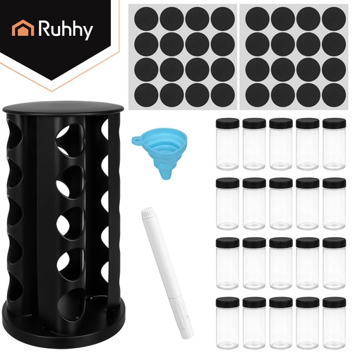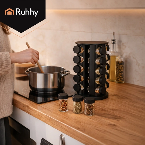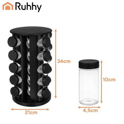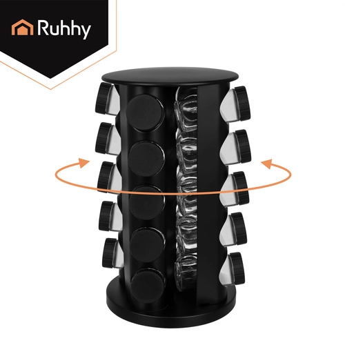 Uspořádejte si kuchyň chytře a elegantně. Kompletní sada kořenek RUHHY nabízí 20 skleněných dóz o objemu 90 ml ve stabilním otočném karuselu, který šetří místo a zajistí rychlý přístup ke každé přísadě. Moderní černý design se hodí do každé kuchyně a z koření udělá stylovou dekoraci.