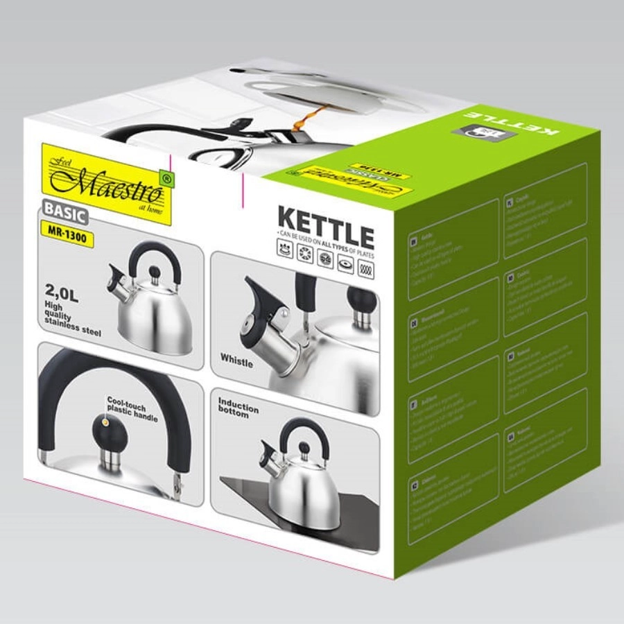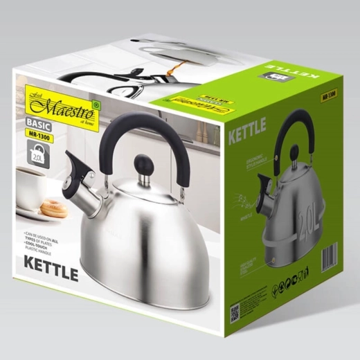Praktická plynová konvice MAESTRO o objemu 2,0 l z kvalitní nerezové oceli je ideální pro každodenní přípravu čaje i kávy. Díky píšťalce bezpečně upozorní na var, vícevrstvé kapslové dno se postará o rychlé a rovnoměrné ohřátí a snadno snímatelné víko usnadní plnění i čištění. Vhodná pro všechny typy sporáků včetně indukce.