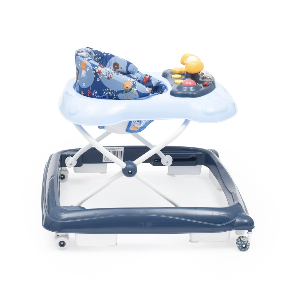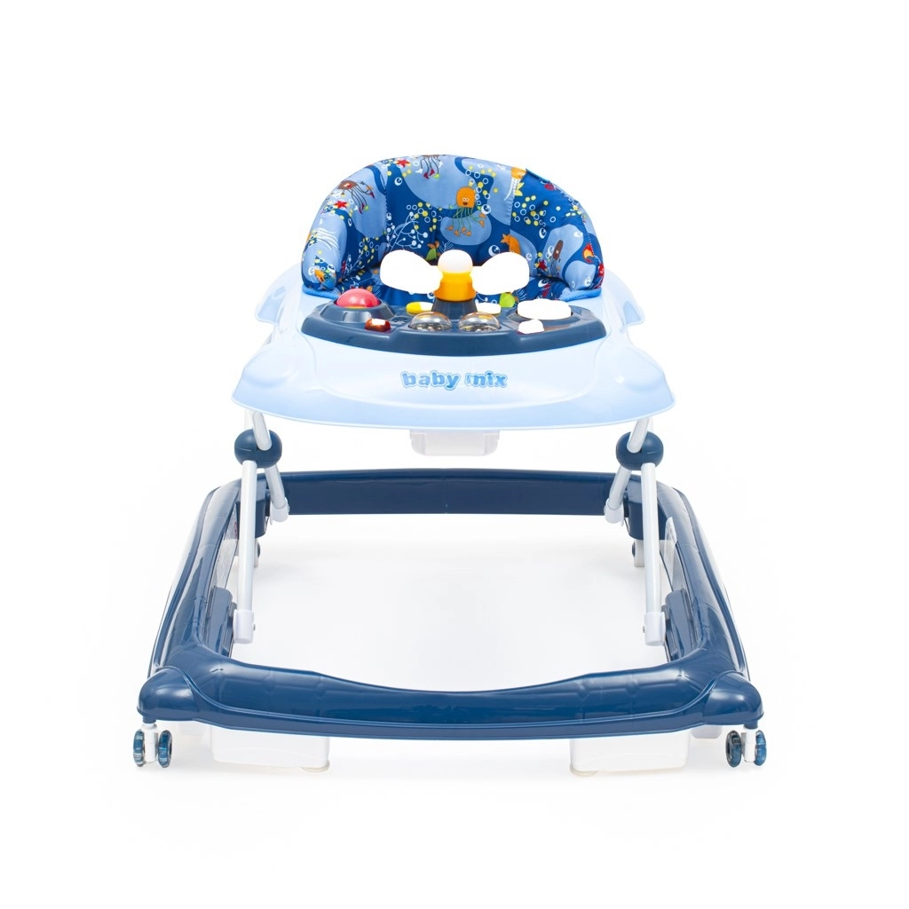 Praktické a zábavné dětské chodítko BABY MIX v tmavě modré barvě podporuje první krůčky a koordinaci pohybů. Nabízí multimediální panel se světly a zvuky, otočný volant s klaksonem, 3 výškové stupně a silikonová kolečka šetrná k podlaze. Pro bezpečí nechybí speciální systém proti převrácení a stabilní široká základna.