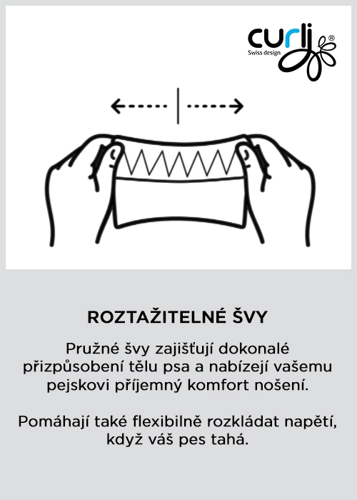 Lehká podšívka Air‑Mesh odvádí teplo a vlhkost. Překřížené popruhy a elastické švy rozloží tah mimo krk a přizpůsobí se anatomii psa.