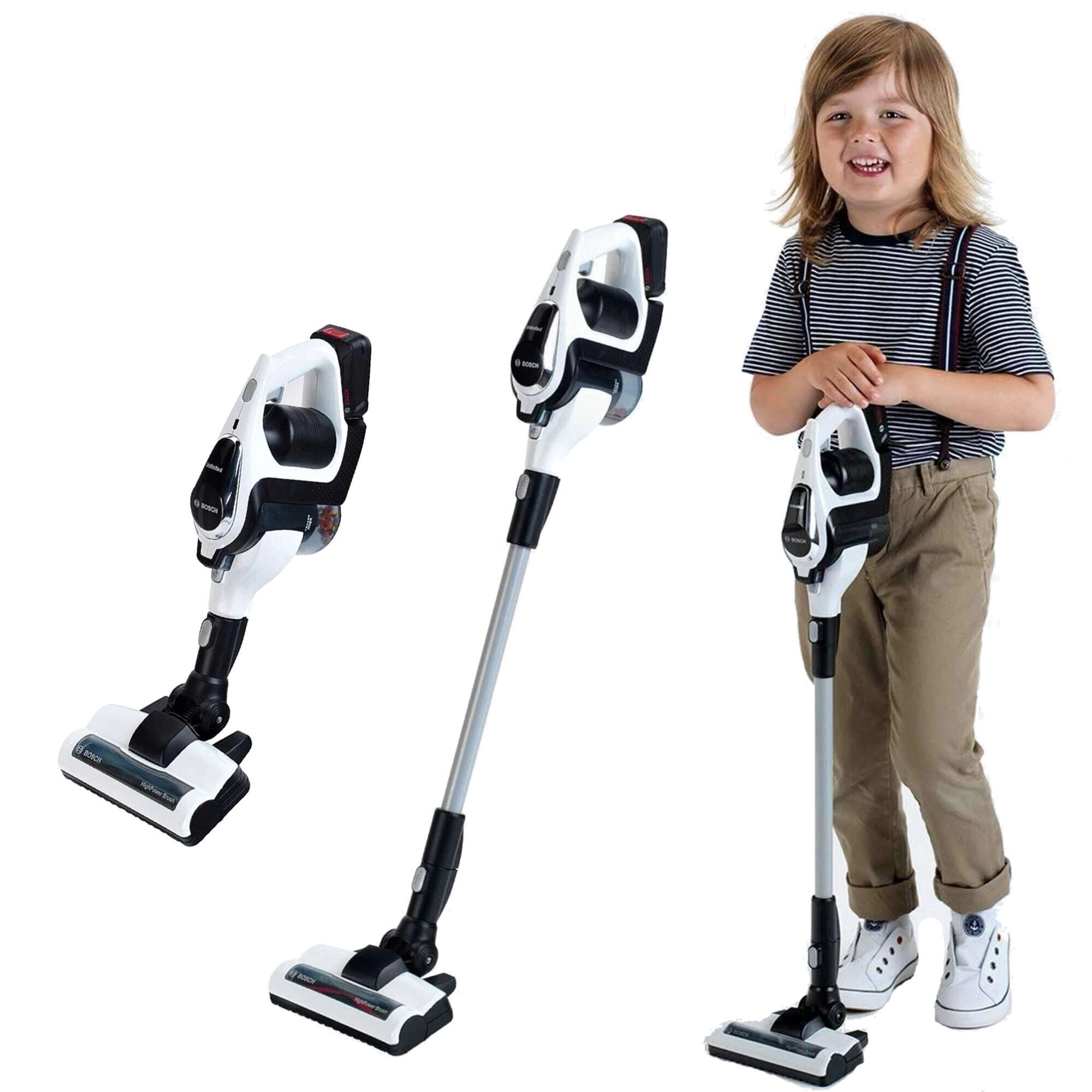 Autentický dětský vysavač BOSCH Unlimited v bílo‑černém provedení se stříbrnou trubkou věrně napodobuje skutečný spotřebič. Díky LED osvětlení a rotujícím kuličkám v průhledném zásobníku působí při „vysávání“ velmi realisticky a přitom zůstává plně bezpečný pro hraní.