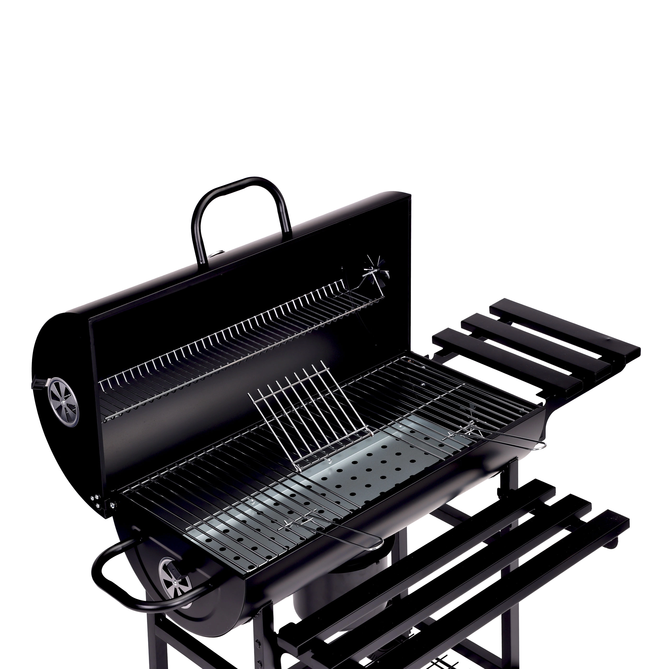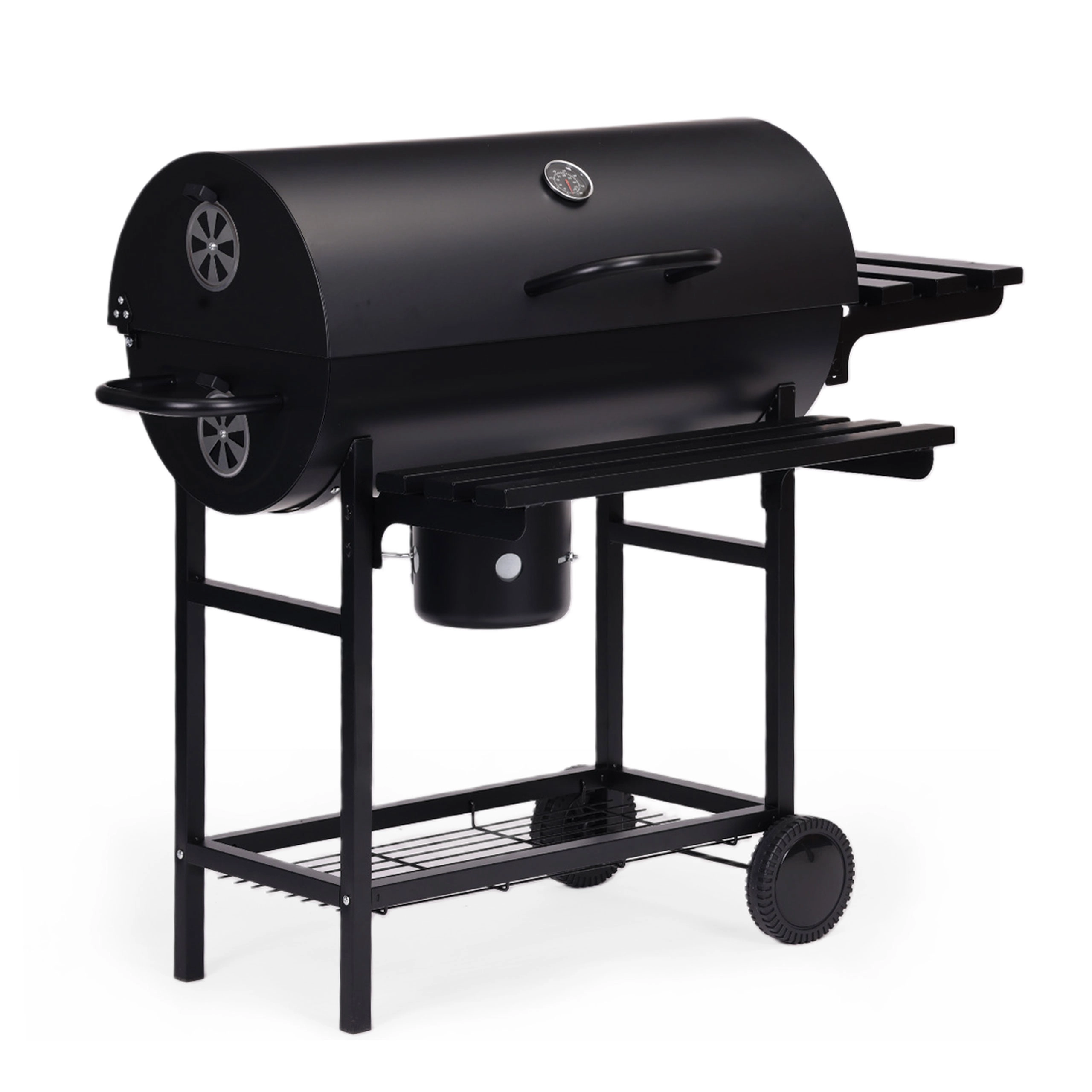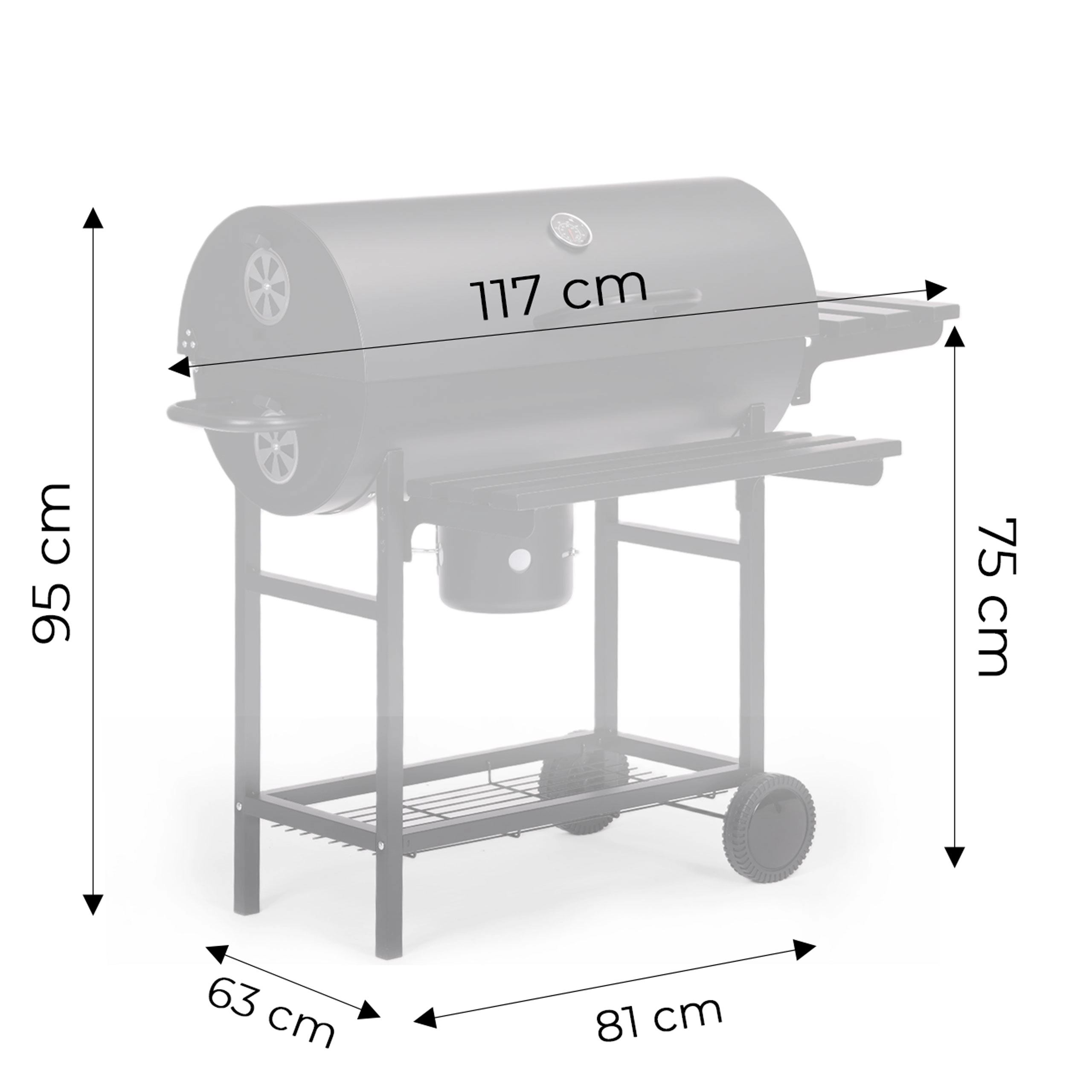 Promyšlená výbava zahrnuje závěsný zachytávač popela pro rychlé čištění, ohřívací rošt 67×10 cm pro udržení teploty hotových jídel a dvě praktické police 64×22 cm a 36×22,5 cm na koření, talíře a náčiní. Díky pevným kolům gril snadno přesunete tam, kde zrovna potřebujete.