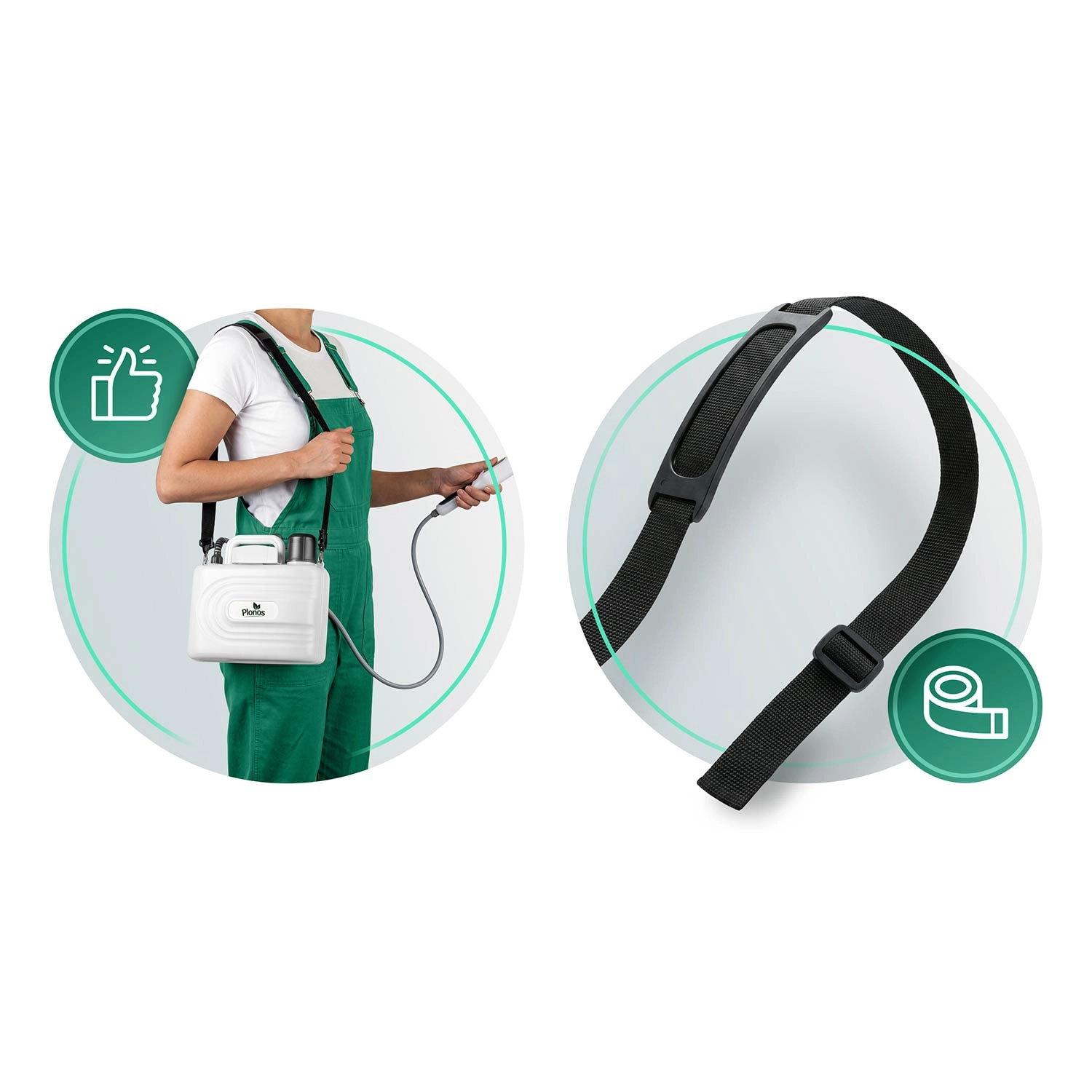 Komfort a jistota při každém použití zajišťují široké polstrované popruhy s nastavením, přehledný LED ukazatel stavu nabití a filtrační sítko proti nečistotám. Odolná PE nádrž 5 l je lehká a chemicky rezistentní, vhodná do zahrady, skleníku i na větší plochy trávníku. Stálý tlak přináší rovnoměrné pokrytí a úspornou spotřebu přípravků.