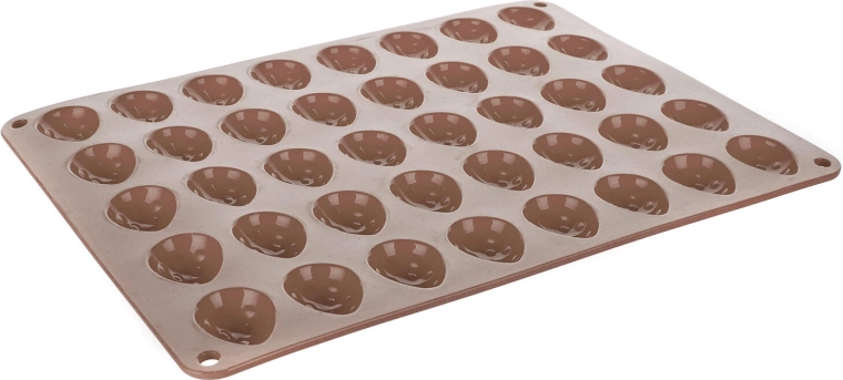 Tato flexibilní silikonová forma je ideální pro pečení oblíbených ořechových skořápek i dalších drobných dezertů. Povrch je přirozeně nepřilnavý, takže se hotové cukroví nelepí a snadno jej vyjmete bez poškození tvaru. Materiál odolává vysokým teplotám do 230 °C a nenasává chutě ani vůně.