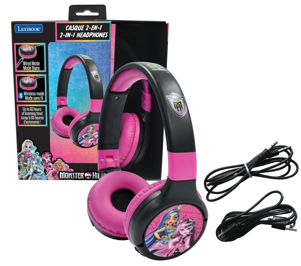 Stylová dětská sluchátka Lexibook MONSTER HIGH kombinují Bluetooth bezdrátové připojení a kabelový režim v jednom. Nabízejí bezpečný limit hlasitosti, skládací konstrukci pro snadné přenášení a až 60 hodin přehrávání na jedno nabití. Pohodlné měkké náušníky, integrované ovládání a atraktivní design s postavami MONSTER HIGH potěší všechny malé fanoušky.