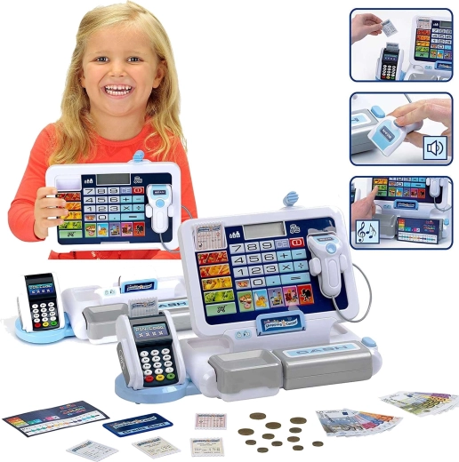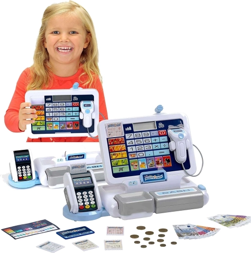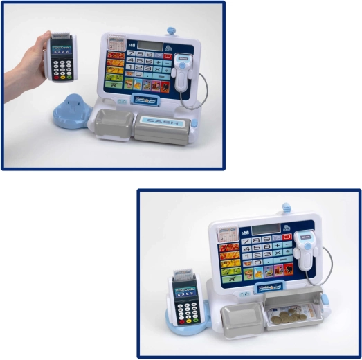 Elektronická pokladna pro děti napodobuje skutečnou pokladnu: má přehledný displej s kalkulačkou, čtečku karet, skener a výklopný šuplík na hotovost se známým „cvaknutím“. Děti mohou „naskenovat“ zboží, zadat ceny a nechat pokladnu vše automaticky sečíst. Design v šedo-bílé barvě působí moderně a čistě.