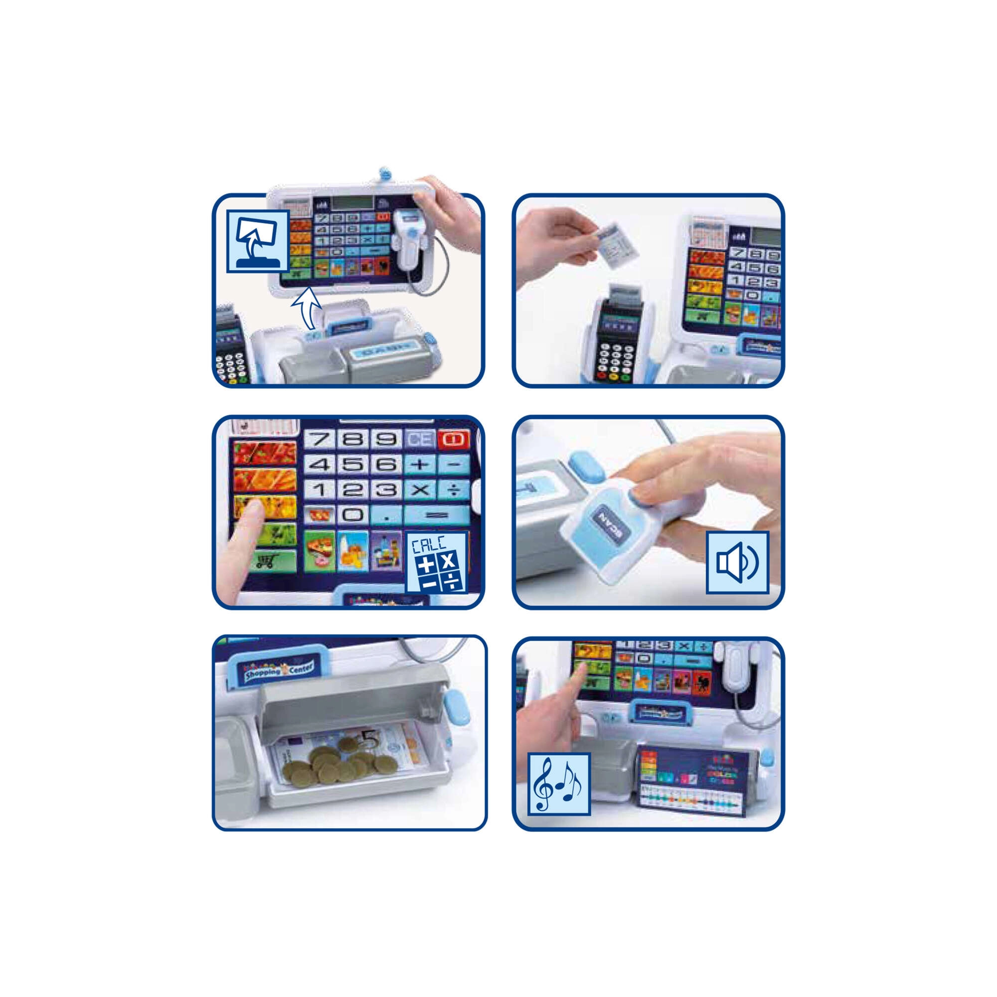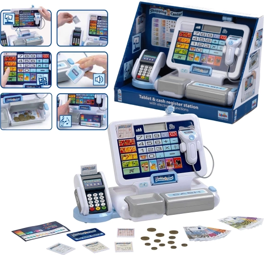 Součástí je bohatá sada doplňků: euromince a bankovky v různých nominálech, účtenky, platební karta a kartička s písničkami pro ještě zábavnější hru. Pokladna je skvělou volbou pro děti od 3 let, které milují hru na obchod a chtějí si procvičit počítání, jemnou motoriku i komunikaci se zákazníky.
