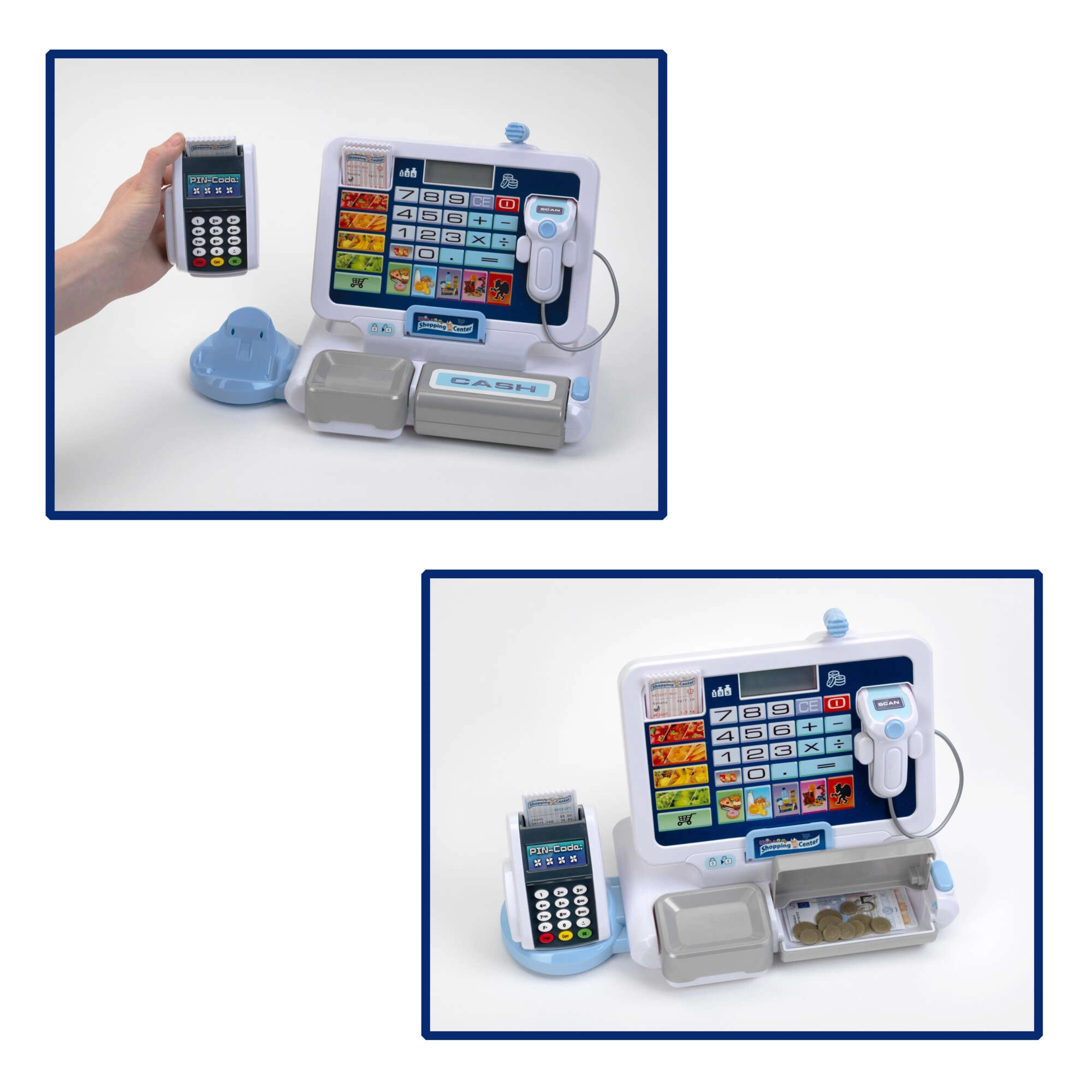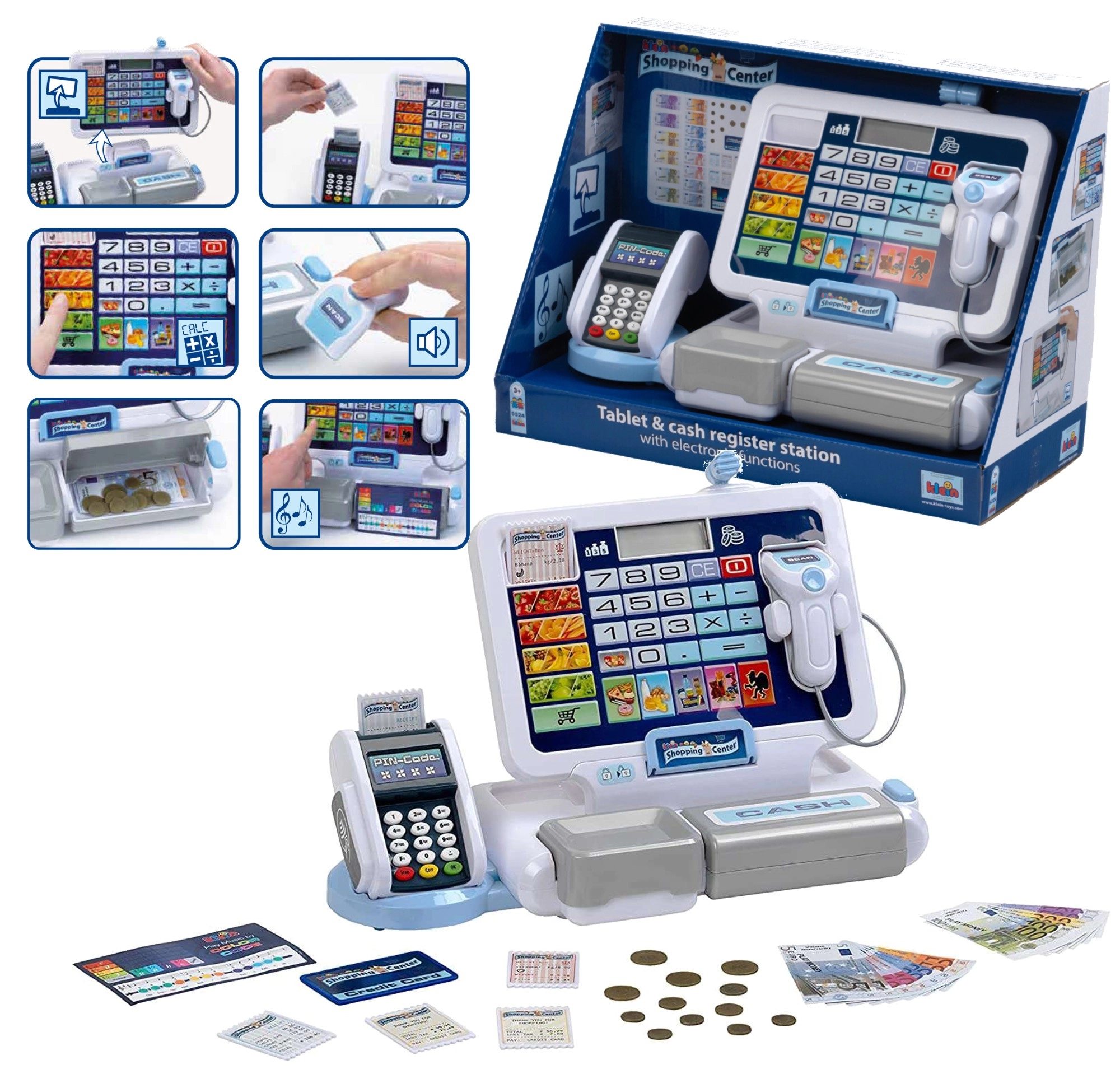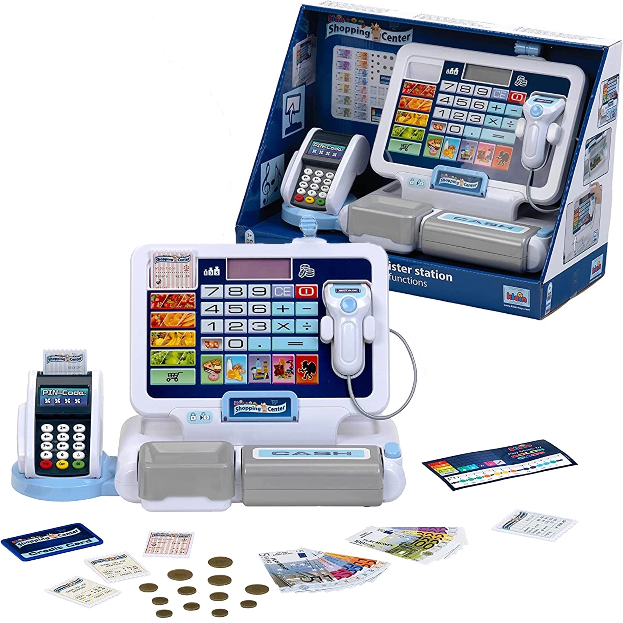 Realistická dětská pokladna s terminálem a skenerem od značky KLEIN přináší autentickou hru na obchod. Nabízí funkční displej s kalkulačkou, otevíratelný šuplík na peníze, čtečku karet, zvukové efekty a bohaté příslušenství včetně euromincí a bankovek, účtenek i „kreditní“ karty – ideální pro rozvoj počítání, finanční gramotnosti a rolové hry.