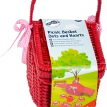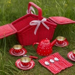 Okouzlující piknikový koš s motivy puntíků a srdíček ukrývá plechovou čajovou soupravu připravenou na každý imaginární čajový dýchánek. Pevné provedení s nastavitelnými pásky na suchý zip a textilním lemem zajišťuje snadné přenášení i ukládání všech dílů. Děti si procvičí společenskou interakci, motoriku i kreativitu.
