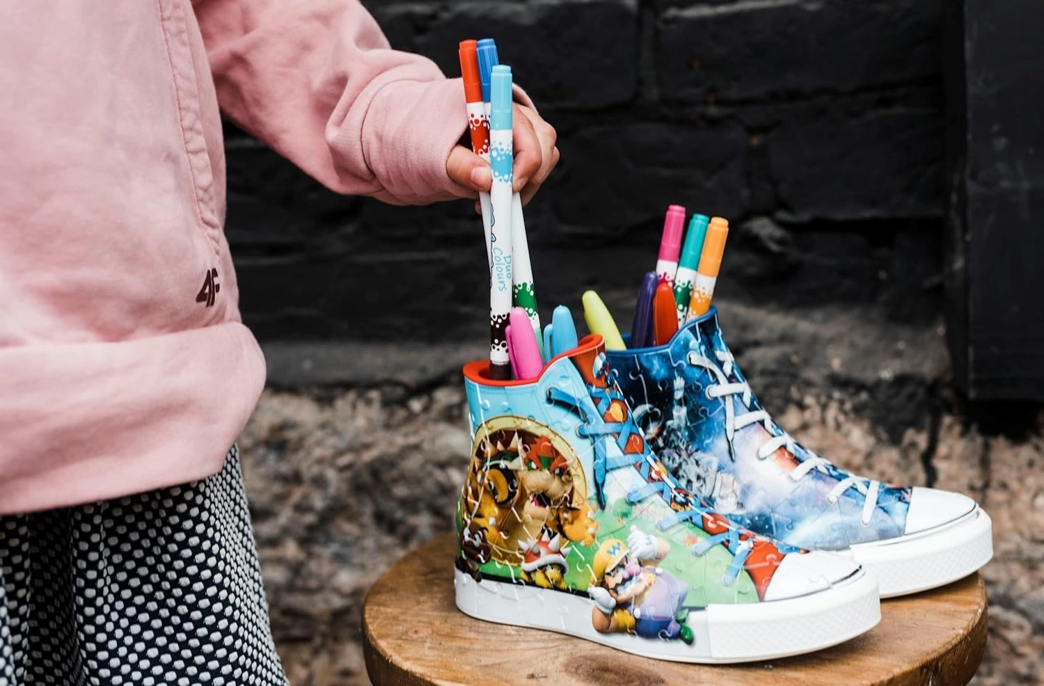 Tento originální 3D puzzle ve tvaru tenisky kombinuje svět SUPER MARIO s chytrou funkčností. Po sestavení získáte pevný a dekorativní stojánek na psací potřeby, který rozzáří dětský stůl a zároveň udrží pořádek. Díky přesnému zpracování dílků Ravensburger je skládání plynulé a zábavné.
