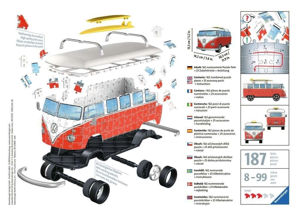 3D puzzle podporuje soustředění a jemnou motoriku, a přitom nabízí zábavný způsob, jak se seznámit s ikonickým designem klasického „busu“. Sestavení je intuitivní a přináší uspokojující výsledek, který potěší každého milovníka aut i puzzle.