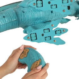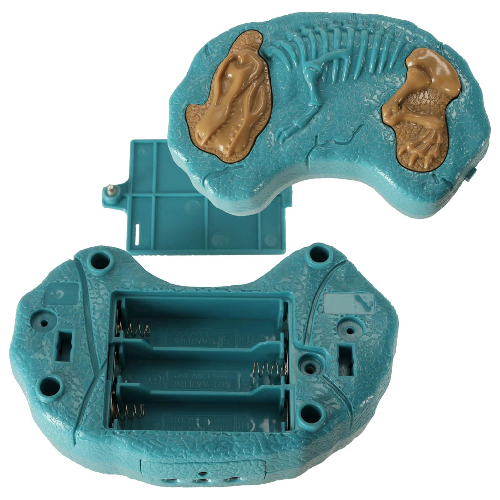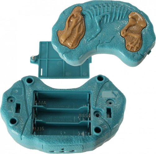 Dálkový ovladač připomínající zkamenělinu se dvěma tlačítky usnadňuje ovládání pohybů a zvuků dinosaura.