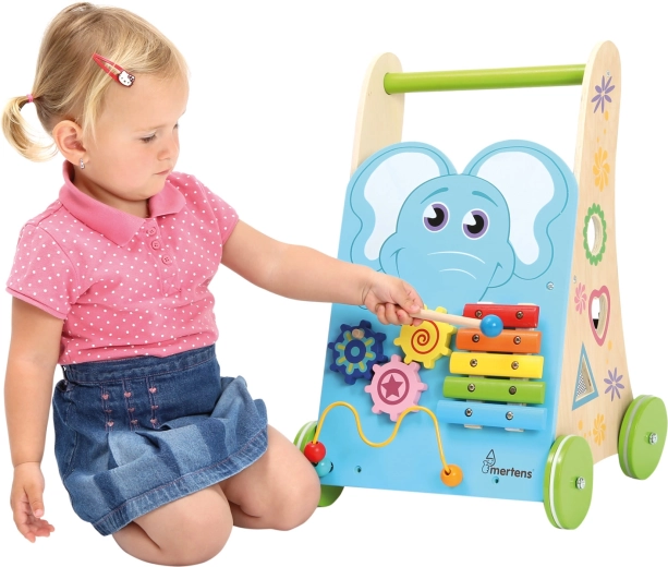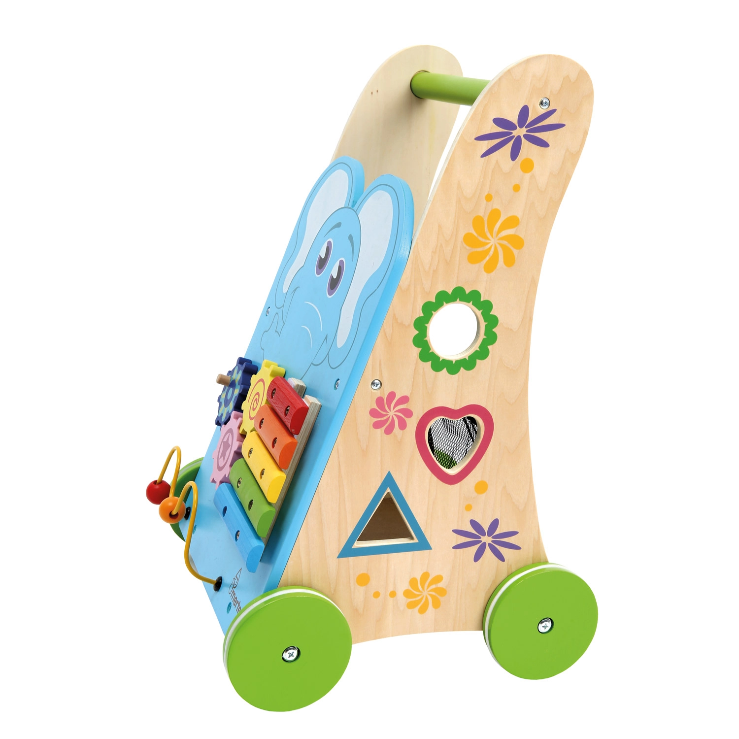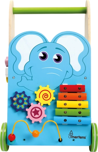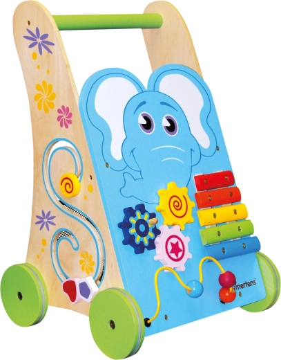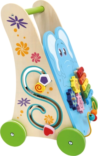 Toto multifunkční dřevěné chodítko pomáhá dětem trénovat rovnováhu, koordinaci i jemnou motoriku. Přední panel je plný aktivit: hudební xylofon s paličkou, ozubená soukolí, korálkový labyrint a vkládačka, které podporují soustředění a logické myšlení.