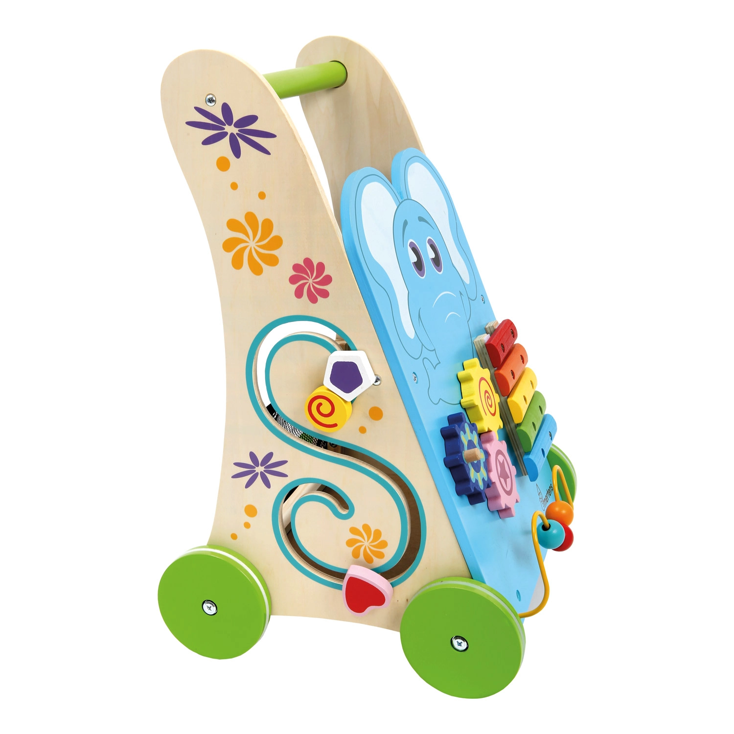 Podpořte první krůčky a všestranný rozvoj vašeho batolete s tímto stabilním dřevěným chodítkem s aktivitami. Nabízí xylofon s jemným zvukem, korálkový labyrint, vkládačku tvarů a ozubená kolečka pro objevování příčin a následků. Gumová kolečka zajišťují tichý chod a ochranu podlahy, robustní konstrukce z 100% FSC dřeva je bezpečná a odolná.