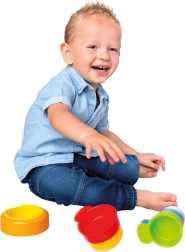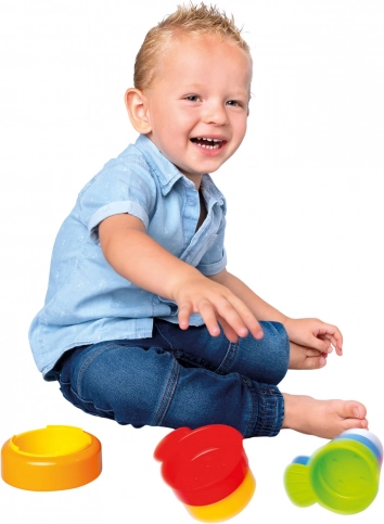 Stohování kroužků na základnu a vkládání do sebe posiluje prstíky, úchop a koordinaci oko–ruka již od 10 měsíců.