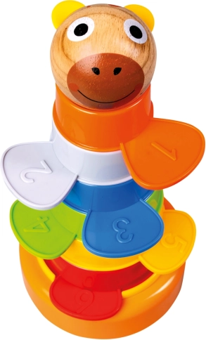 Tato veselá věž spojuje hraní a učení v jednom. Šest barevných formiček se skládá na stabilní základnu a doplňuje je kulička ve tvaru hlavy medvídka z dřeva. Děti mohou prvky nejen stohovat, ale také je vkládat do sebe, třídit podle velikosti či barvy a poznávat první čísla.