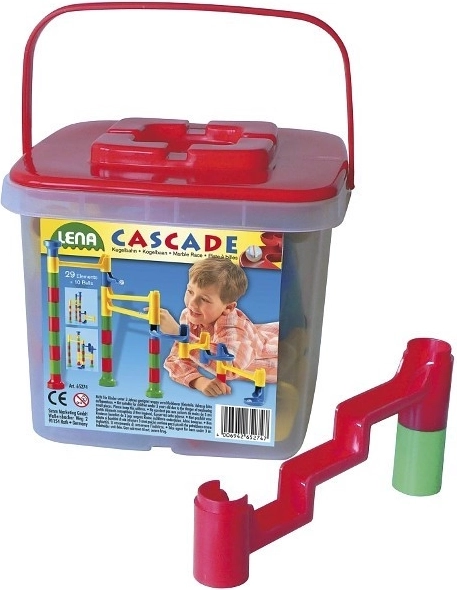Stavebnice Cascade přináší barevnou kaskádu zábavy. Z 29 dílů lze vytvářet rozmanité kuličkové dráhy, po nichž kulička sviští přes různé úrovně a překážky. Praktický kyblík s rukojetí usnadňuje ukládání i přenášení, takže si děti mohou hrát doma i na cestách.
