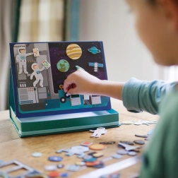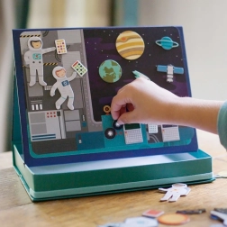 Magnetické divadlo vesmír přináší dětem nekonečné možnosti kombinací a scén na dvou magnetických pozadích – ve vesmíru a na vesmírné stanici. Díky více než 50 magnetickým dílkům mohou malí průzkumníci vytvářet originální příběhy, rozvíjet fantazii a jemnou motoriku. Praktická krabice se stojánkem a zarážkami umožňuje snadné postavení scény kdekoli.