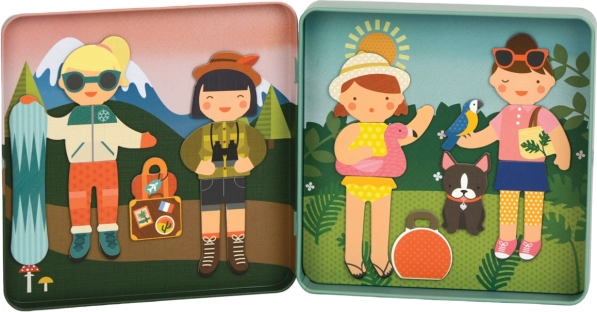 Zábavná magnetická knížka do kapsy pro malé cestovatele. Díky více než 25 magnetkám mohou děti mixovat dílky a vytvářet postavičky, objevovat dvě scénérie uvnitř a rozvíjet představivost a jemnou motoriku. Praktická plechová krabička se pevně zavírá, takže je ideální na cesty.