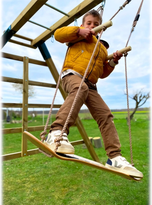 Robustní dřevěná madla na lanech snadno posunete do ideální výšky. Poskytují oporu při naskakování i houpání ve stoje.